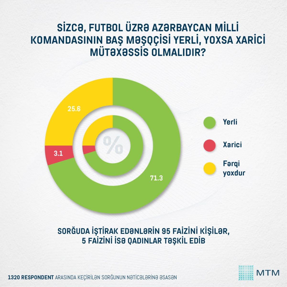 Lakin 2025-ci ilin noyabrında vətəndaşlar arasında eyni mövzuda aparılan sorğu mənzərəni yenidən dəyişib. Bu dəfə, yerli baş məşqçiyə üstünlük verənlərin payı 71,3%-ə düşərək əvvəlki pik göstəricidən bir qədər uzaqlaşmaqla yanaşı, xarici mütəxəssisi dəstəkləyənlərin də payı az (cəmi 3,1%) olub.