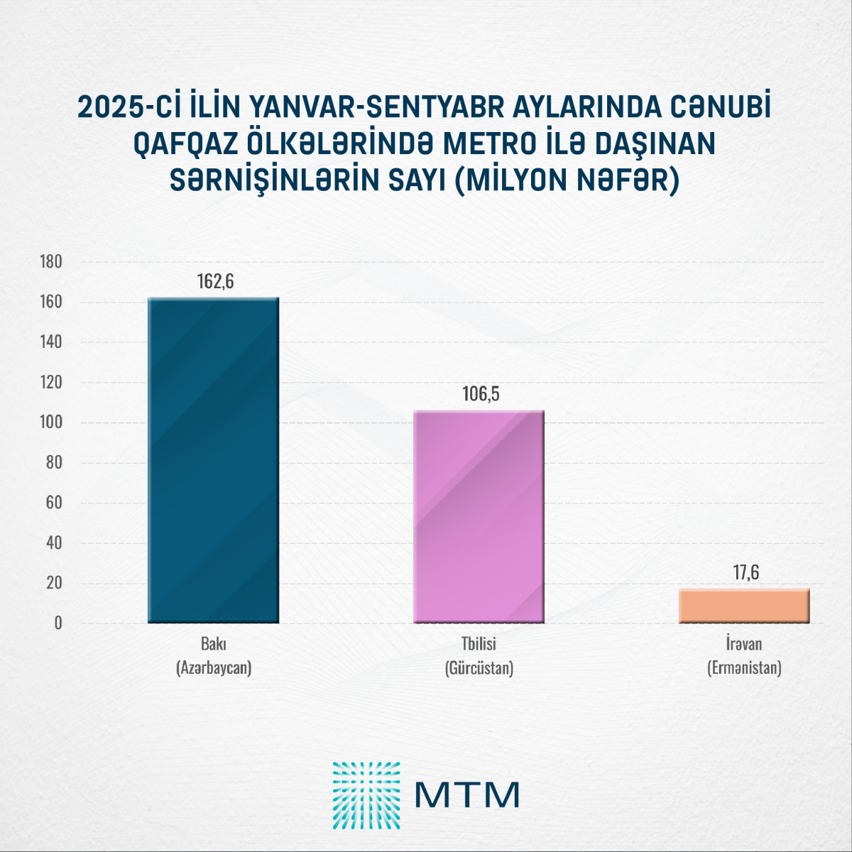 2025-ci ilin yanvar–sentyabr ayları üzrə Cənubi Qafqaz ölkələrində metro nəqliyyatı ilə daşınan sərnişinlərin sayının müqayisəli təhlilnə əsasən, üç ölkə arasında ən yüksək göstərici Azərbaycan Respublikasında, yəni Bakı şəhərində müşahidə olunub. Belə ki, sözügedən dövrdə Azərbaycanda metro nəqliyyatından 162,6 milyon nəfər istifadə edib.
