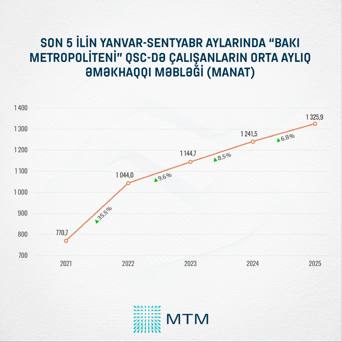 2025-ci ilin yanvar–sentyabr aylarında isə Bakı Metropoliteni QSC-də çalışan işçilərin orta əməkhaqqı 1 325,9 manat olub və 2024-cü ilin müvafiq dövrü ilə müqayisədə 84,4 manat və ya 6,8% artım qeydə alınıb.