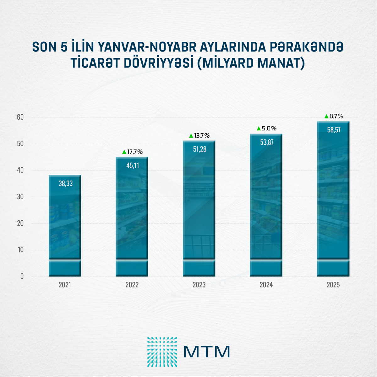 Media Təhlil Mərkəzinin (MTM) Dövlət Statistika Komitəsinin rəsmi məlumatları əsasında apardığı təhlilə görə, 2025-ci ilin yanvar–noyabr aylarında ölkədə pərakəndə ticarət dövriyyəsinin həcmi ötən ilin eyni dövrü ilə müqayisədə 8,7 faiz və ya 4,7 milyard manat artaraq 58,57 milyard manata çatıb. Müqayisə üçün qeyd edək ki, 2024-cü ilin ilk 11 ayında pərakəndə ticarət dövriyyəsi 53,87 milyard manat təşkil edib.