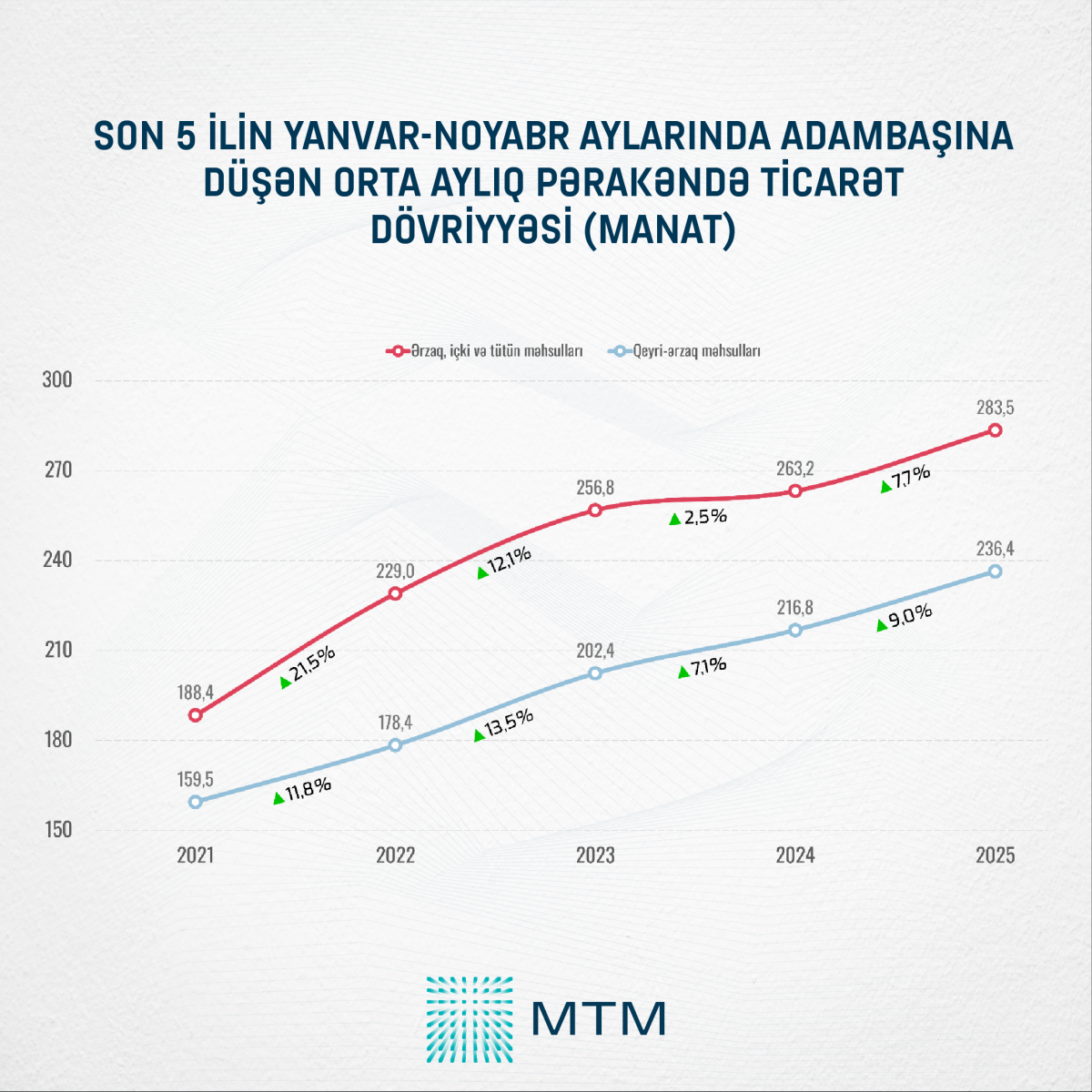 2025-ci ildə hər iki məhsul qrupu üzrə artım tempi yenidən sürətlənib. Ərzaq, içki və tütün məhsulları üzrə göstərici 2,4 milyard manat və ya 8,1 faiz artaraq 31,94 milyard manata çatıb. Qeyri-ərzaq məhsulları üzrə isə artım 2,3 milyard manat və ya 9,5 faiz təşkil edib və göstərici 26,63 milyard manat olub.