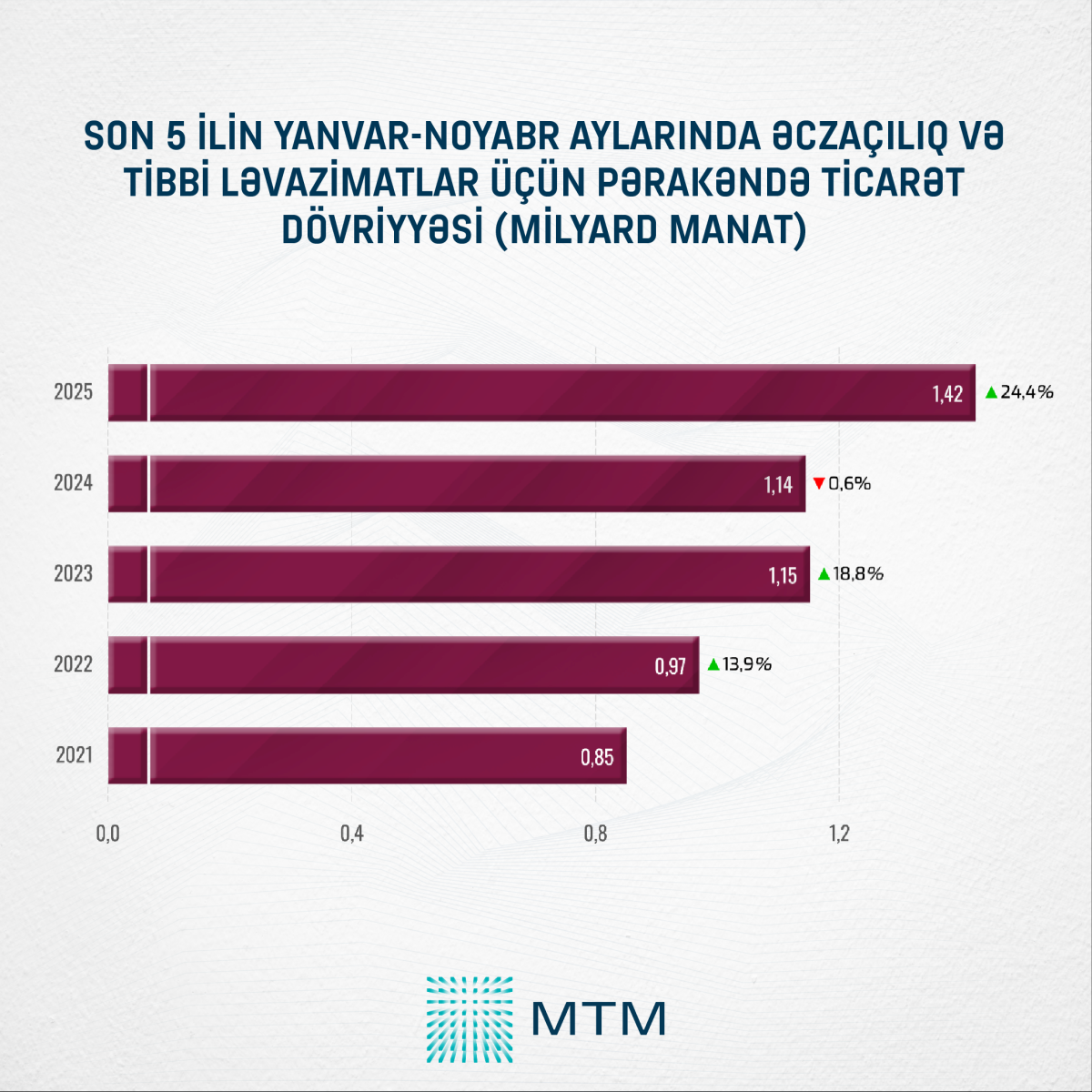 2025-ci ildə isə son beş ilin ən yüksək artımı müşahidə olunub. 2025-ci ilin yanvar–noyabr aylarında əhalinin əczaçılıq və tibbi ləvazimatlara çəkdiyi xərclər ötən illə müqayisədə 0,28 milyard manat və ya 24,4 faiz artaraq 1,42 milyard manata çatıb. Müqayisə üçün qeyd edək ki, 2024-cü ilin eyni dövründə bu göstərici 1,14 milyard manat təşkil edib.