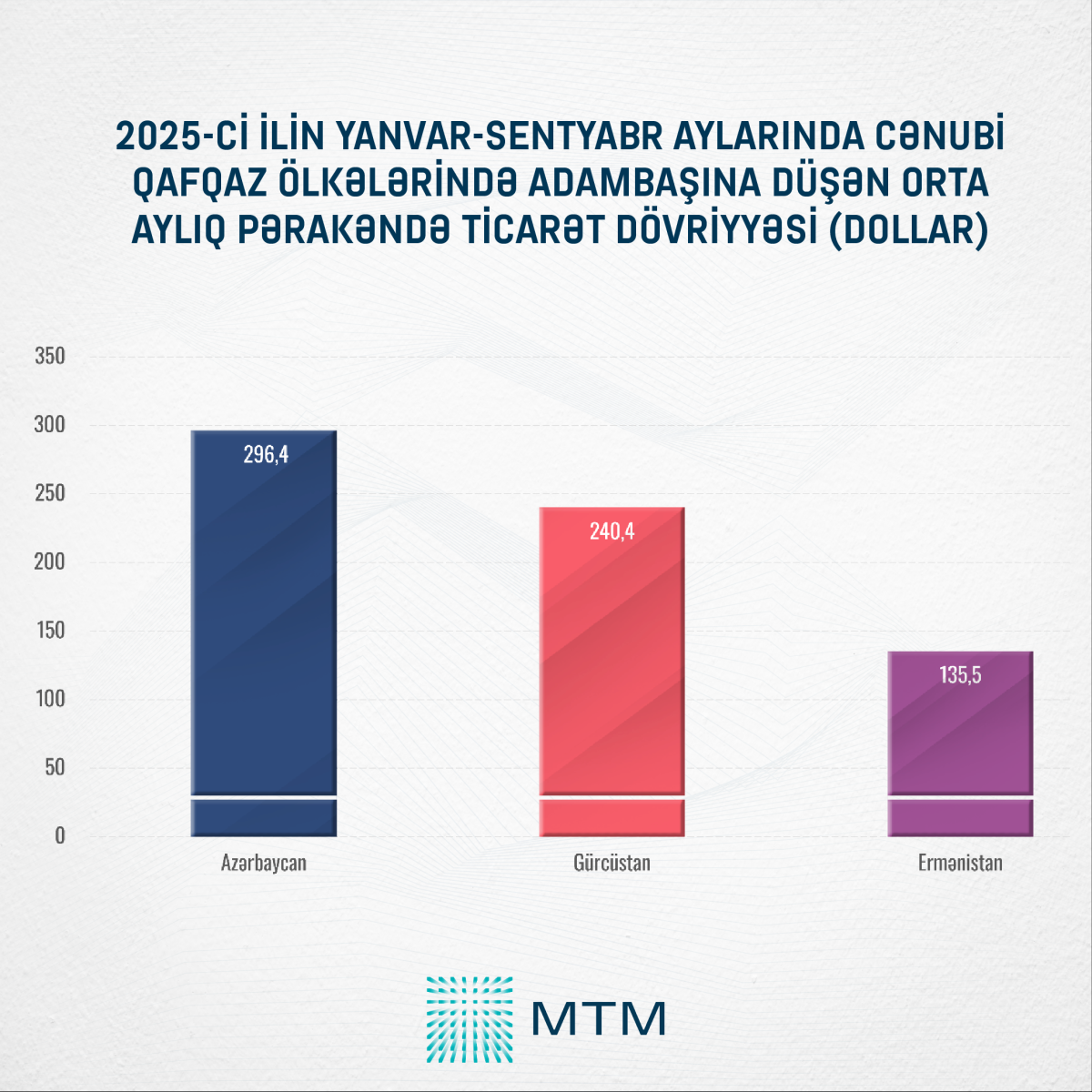Cənubi Qafqaz ölkələrinin Dövlət Statistika Komitələrinin rəsmi internet səhifələrindən toplanan məlumatlar göstərir ki, cari ilin yanvar–sentyabr aylarında adambaşına düşən orta aylıq pərakəndə ticarət dövriyyəsinin həcminə görə Azərbaycan lider mövqedədir.