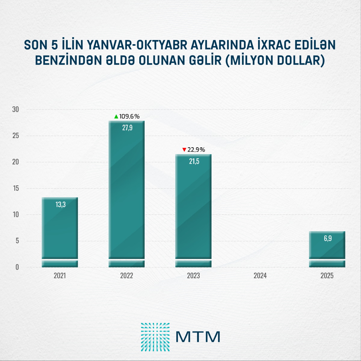 Cari ilin yanvar–oktyabr aylarında benzin ixracından əldə olunan gəlir 6,9 milyon ABŞ dolları təşkil edib ki, bu da son beş il ərzində müvafiq dövr üzrə qeydə alınan ən aşağı göstəricidir. Müqayisə üçün qeyd edək ki, 2021-ci ilin yanvar–oktyabr aylarında benzin ixracından 13,3 milyon ABŞ dolları gəlir əldə olunub. 2022-ci ildə bu göstərici 14,6 milyon ABŞ dolları və ya 109,6% artaraq (iki dəfədən çox) 27,9 milyon ABŞ dollarına yüksəlib ki, bu da son beş il üzrə ən yüksək nəticə hesab olunur. 2023-cü ildə isə benzin ixracından əldə olunan gəlir əvvəlki illə müqayisədə 6,4 milyon ABŞ dolları və ya 22,9% azalıb.