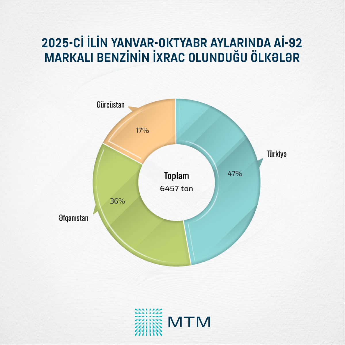 Aparılan təhlilə əsasən, ölkə üzrə ixracda ən böyük pay Aİ-92 markalı benzinin payına düşür. 2025-ci ilin yanvar–oktyabr aylarında ümumilikdə 6 457 ton Aİ-92 markalı benzin ixrac olunub və bu ixrac Türkiyə, Əfqanıstan və Gürcüstan istiqamətində həyata keçirilib.