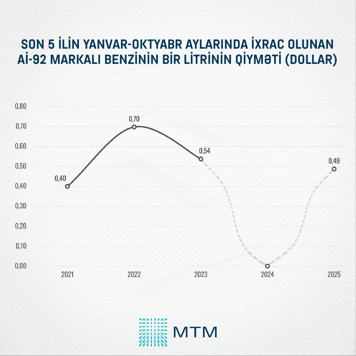 Rəsmi məlumatlara əsasən, 2021-ci ilin yanvar–oktyabr aylarında ixrac olunan Aİ-92 markalı benzinin bir litrinin orta qiyməti 0,4 ABŞ dolları təşkil edib. 2022-ci ilin eyni dövründə bu göstərici 0,7 ABŞ dollarına yüksəlib ki, bu da əvvəlki illə müqayisədə 0,3 ABŞ dolları və ya 74,4% artım deməkdir. 2023-cü ildə Aİ-92 markalı benzinin litrinin qiyməti 23% və ya 0,16 ABŞ dolları azalaraq 0,54 ABŞ dolları səviyyəsində qeydə alınıb. Cari ildə isə ixrac olunan Aİ-92 markalı benzinin bir litrinin orta qiyməti 0,49 ABŞ dolları olub.