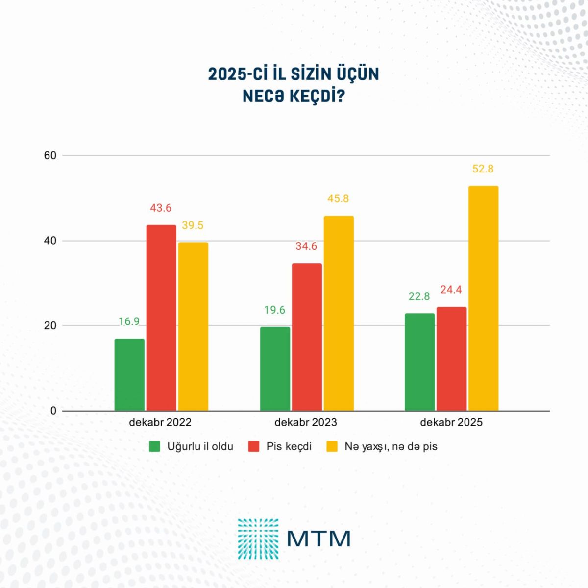 Sorğu nəticələri göstərir ki, Yeni il ərəfəsində aparılan qiymətləndirmələrdə müsbət dinamika formalaşıb. Belə ki, 2022-ci ilin dekabrında respondentlərin 43,6 faizi ili uğursuz hesab etdiyi halda, 2025-ci ildə bu göstərici 24,4 faizə enib. Eyni zamanda, ili uğurlu qiymətləndirənlərin payı 16,9 faizdən 22,8 faizə yüksəlib. Respondentlərin 52,8 faizi isə ili “nə yaxşı, nə də pis” kimi dəyərləndirib ki, bu da cəmiyyətin hadisələrə daha balanslı və realist yanaşmağa başladığını göstərir.