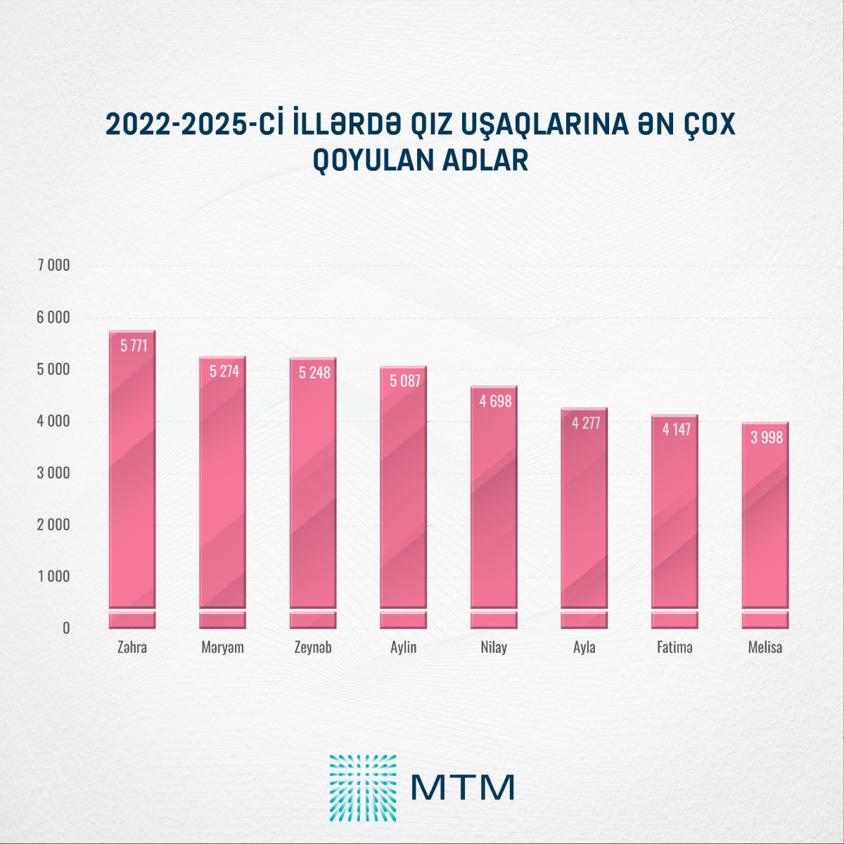 Aparılan təhlil zamanı məlum olub ki, qeyd olunan dövr ərzində 5 771 qız uşağına Zəhra adı qoyulub və bu ad siyahıda birinci yerdə qərarlaşıb. Həmin dövrdə 5 274 uşağa Məryəm, 5 248 uşağa isə Zeynəb adı verilib. 5 087 uşağa Aylin, 4 698 uşağa Nilay, 4 277 uşağa Ayla, 4 147 uşağa Fatimə adı qoyulub. Yeni doğulan 3998 uşağa isə Melisa adı verilib.