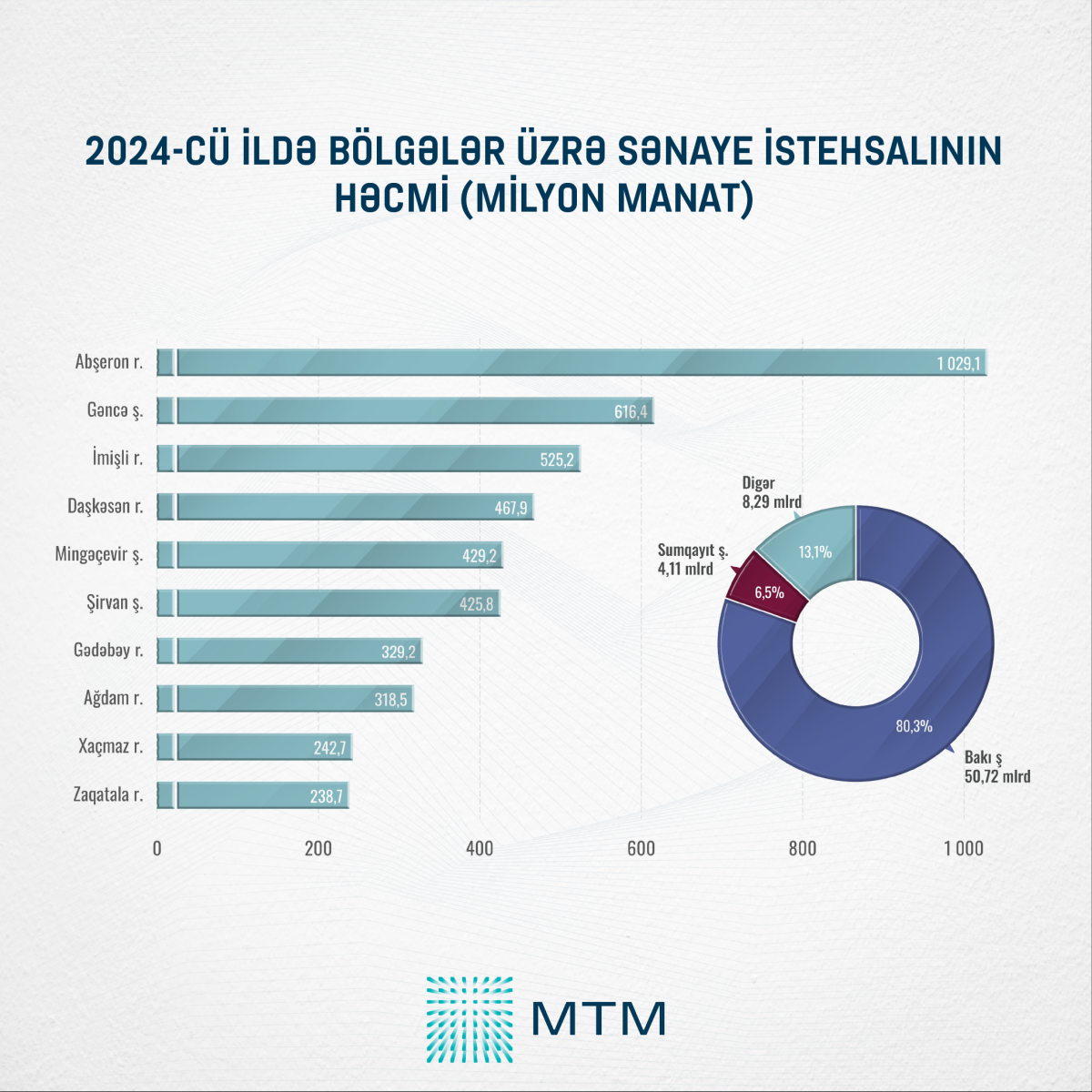 2025-ci ildə bölgələr üzrə sənaye istehsalında əsas pay paytaxt Bakı şəhərinə məxsus olub. Ümumi sənaye istehsalının 80,3 faizi və ya 50,72 milyard manatı Bakının payına düşüb. Bu vəziyyət neft və qaz hasilatının əsasən paytaxt ərazisində cəmləşməsi ilə izah olunur.