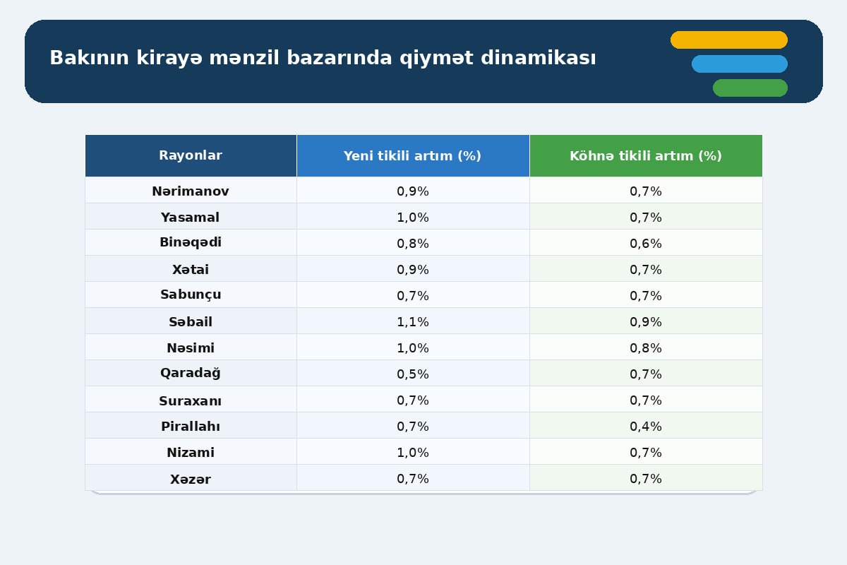Bu isə onu göstərir ki, Bakı daşınmaz əmlak bazarı həm investisiya, həm də yaşayış məqsədli alıcılar üçün regionun ən stabil və perspektivli bazarlarından biri olaraq qalır. Ötən ay Bakının inzibati rayonları üzrə kirayə mənzil bazarında da qiymətlərdə ümumi artım tendensiyası müşahidə olunub.