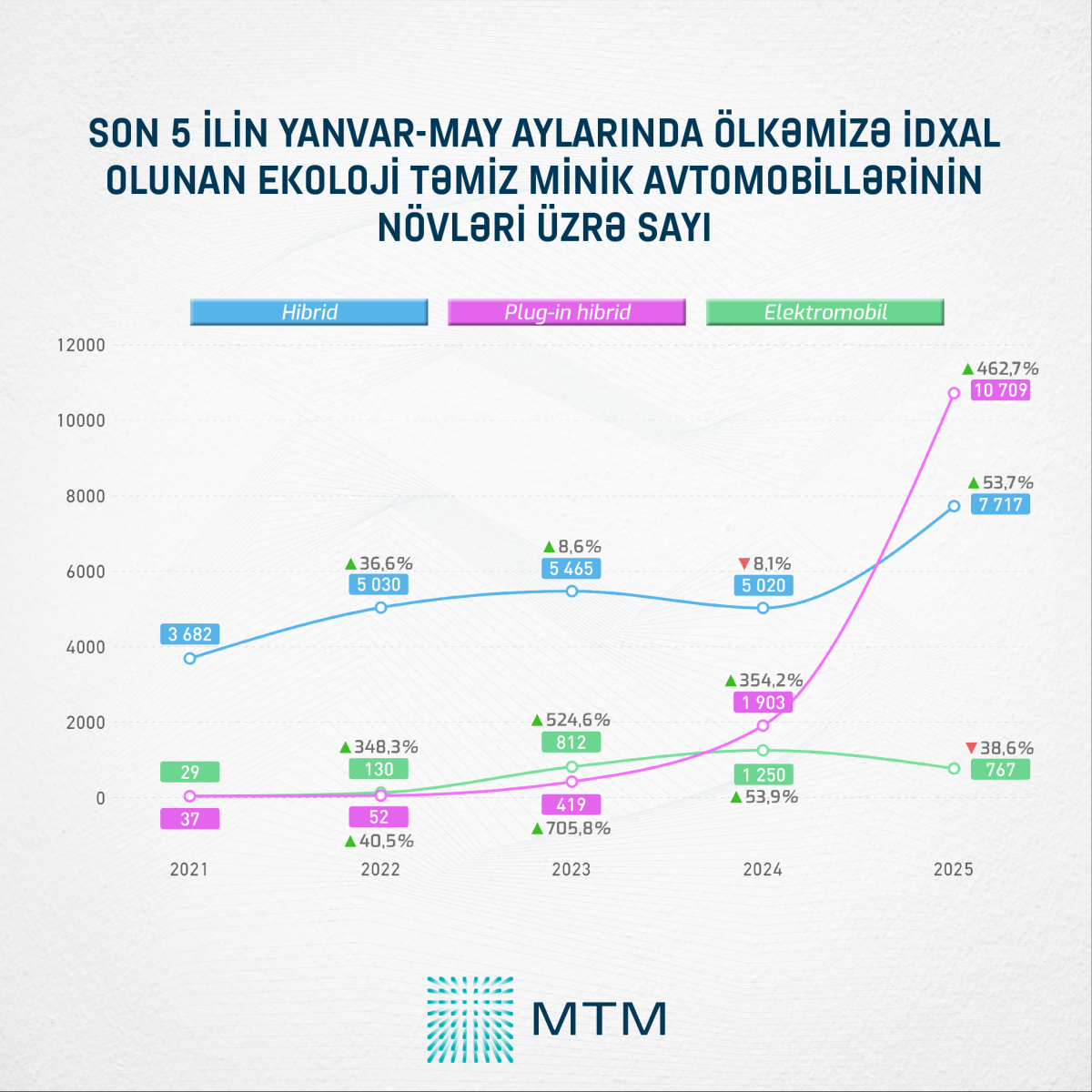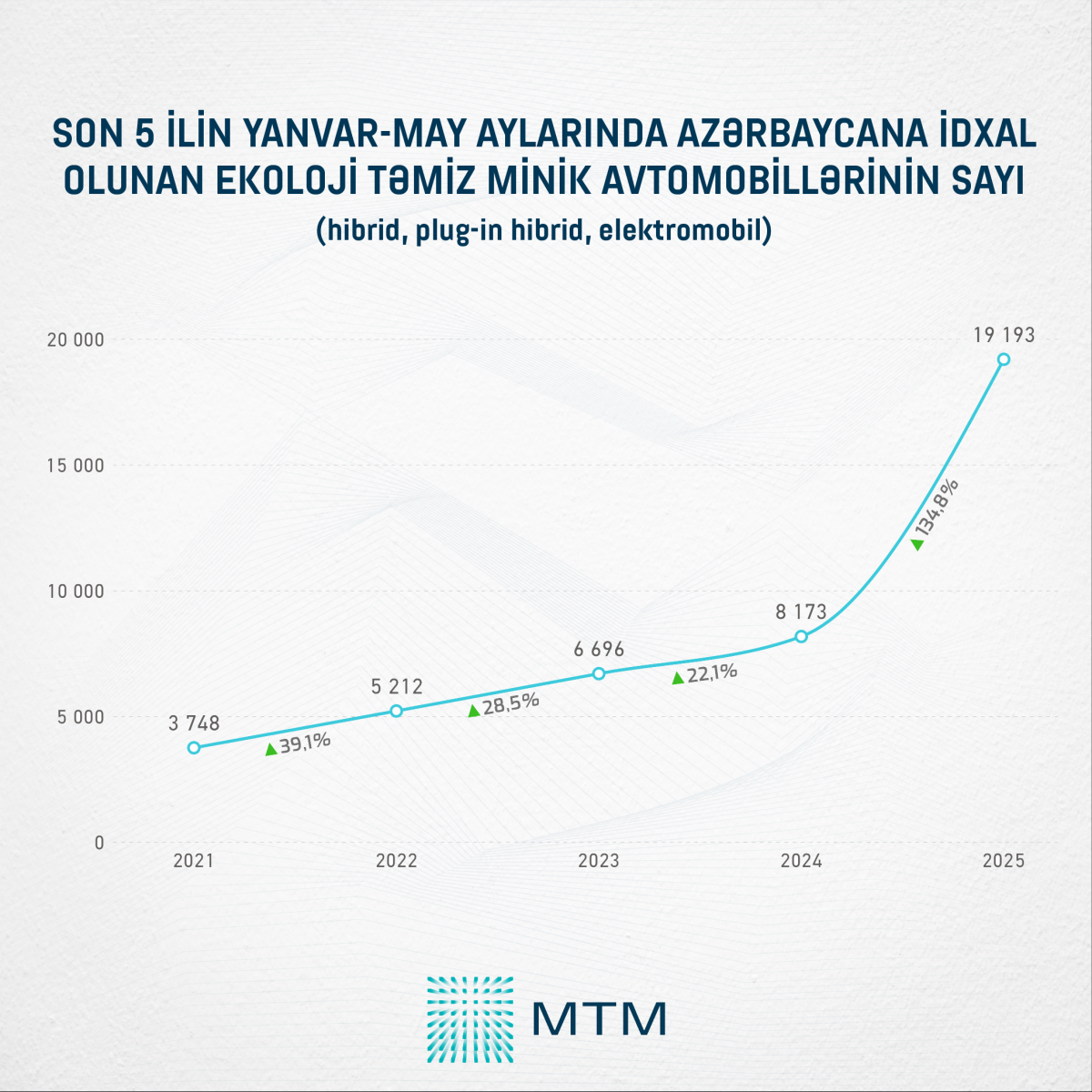 Media Təhlil Mərkəzinin (MTM) Dövlət Statistika Komitəsinin açıqladığı rəsmi rəqəmlər əsasında apardığı təhlilə görə, 2025-ci ilin ilk 5 ayı ərzində ölkəmizə idxal olunan ekoloji təmiz minik avtomobillərinin sayında əhəmiyyətli dərəcədə artım müşahidə olunub. Daha dəqiq desək, cari ilin yanvar-may aylarında ölkəyə 19 193 ədəd ekoloji təmiz minik avtomobili gətirilib. Bu göstərici ötən ilin eyni dövrü ilə müqayisədə 134,8% (2,3 dəfə) və ya 11 020 ədəd çoxdur.
