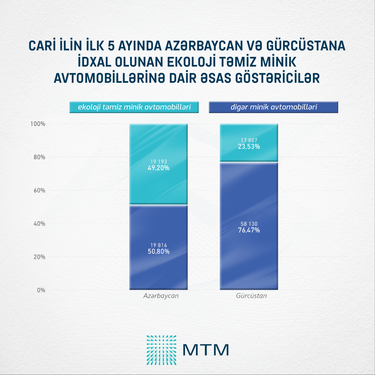 Azərbaycanda bu göstərici 49,2%, Gürcüstanda 23,53% təşkil edib. Say baxımından da Azərbaycana idxal olunan ekoloji təmiz minik avtomobillərinin sayı (19 193) Gürcüstanla (17 887) müqayisədə daha çoxdur.