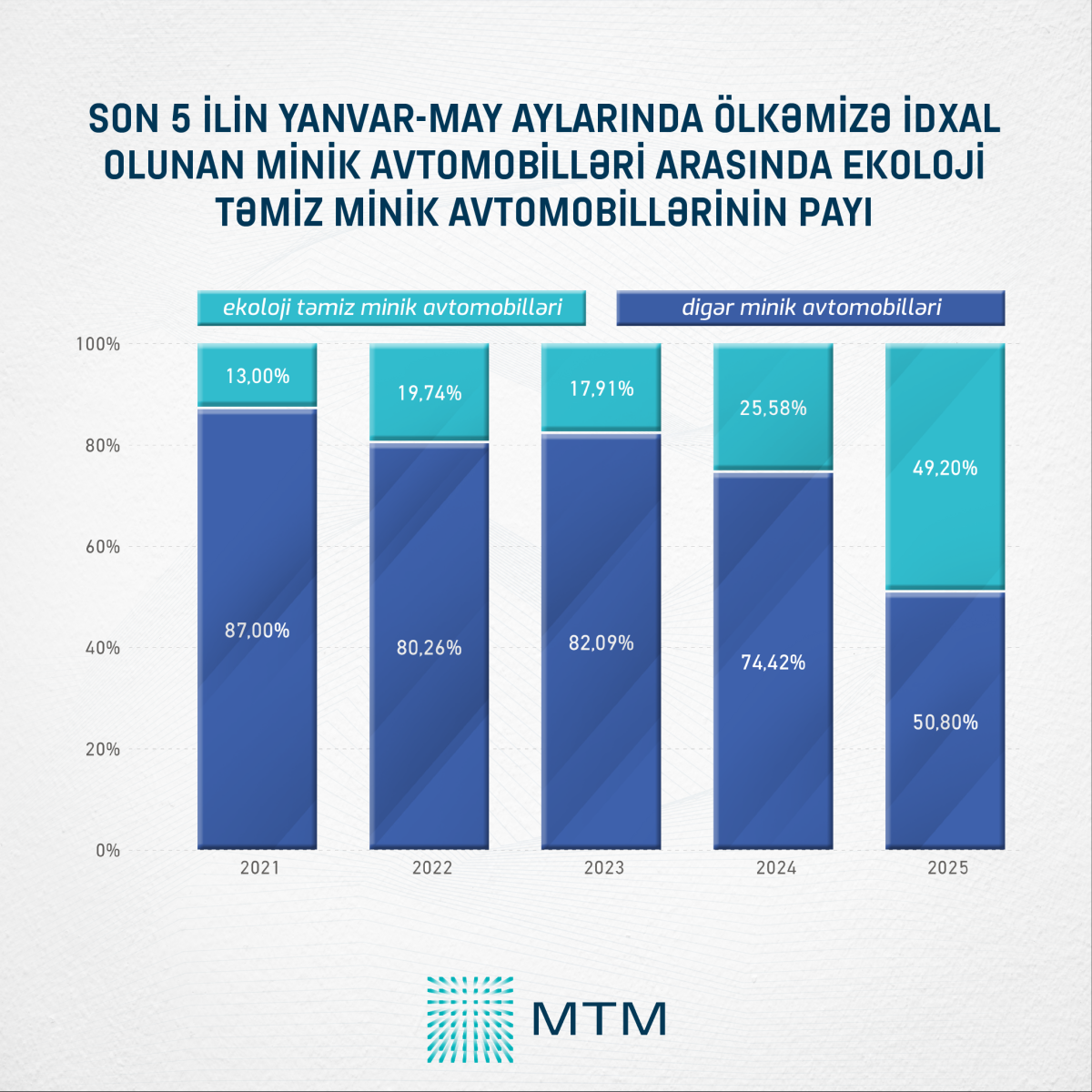 Cari ilin yanvar-may aylarında Azərbaycana idxal olunan ekoloji təmiz minik avtomobilləri ümumi minik avtomobilləri idxalının 49,2%-ni təşkil edib ki, bu da indiyədək qeydə alınan ən yüksək göstəricidir.