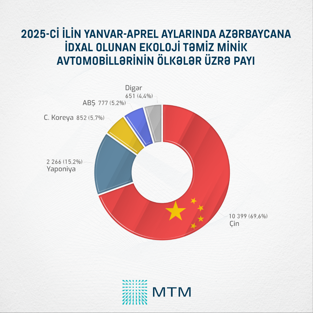 Cari ilin yanvar-aprel aylarında ölkəmizə idxal olunan ekoloji təmiz minik avtomobillərinin 69,6%-i və ya 10 399-u Çindən gətirilib.