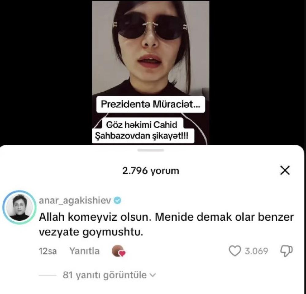 Xatırladaq ki, Humay Əliyeva üzləşdiyi vəziyyətlə bağlı tibbi ekspertizanın təyin edildiyini və gözündə uğursuz əməliyyat olunmasının təsdiqləndiyini əlavə etmişdi. H.Əliyeva məsələni sosial şəbəkə hesablarında ictimailəşdirəndən sonra onun videomüraciətinə tanınmış stilist Anar Ağakişiyev də rəy bildirərək oxşar problemlə üzləşdiyini qeyd etmişdi.