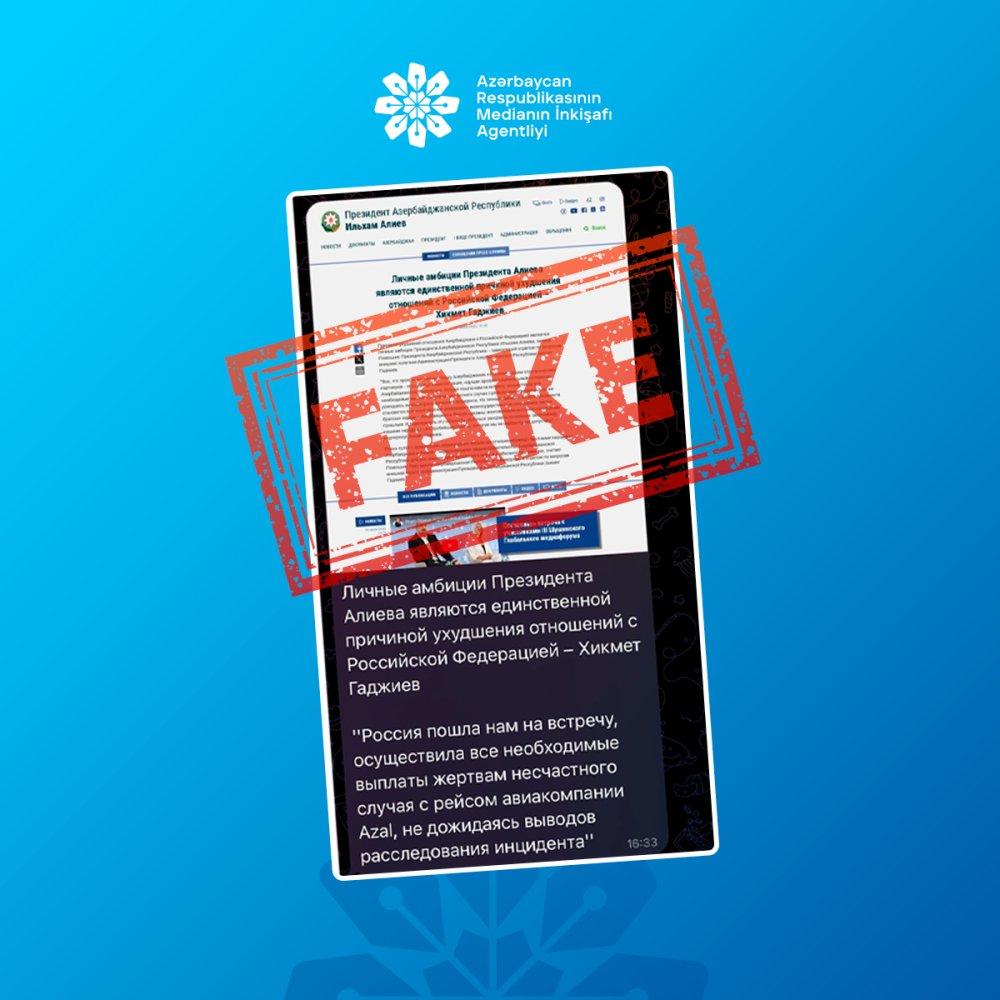 Bir sıra sosial şəbəkə hesablarında Azərbaycan Respublikası Prezidentinin köməkçisi Hikmət Hacıyevin adından Rusiya-Azərbaycan münasibətlərinə dair həqiqətə uyğun olmayan saxta açıqlama yayılmışdır.
