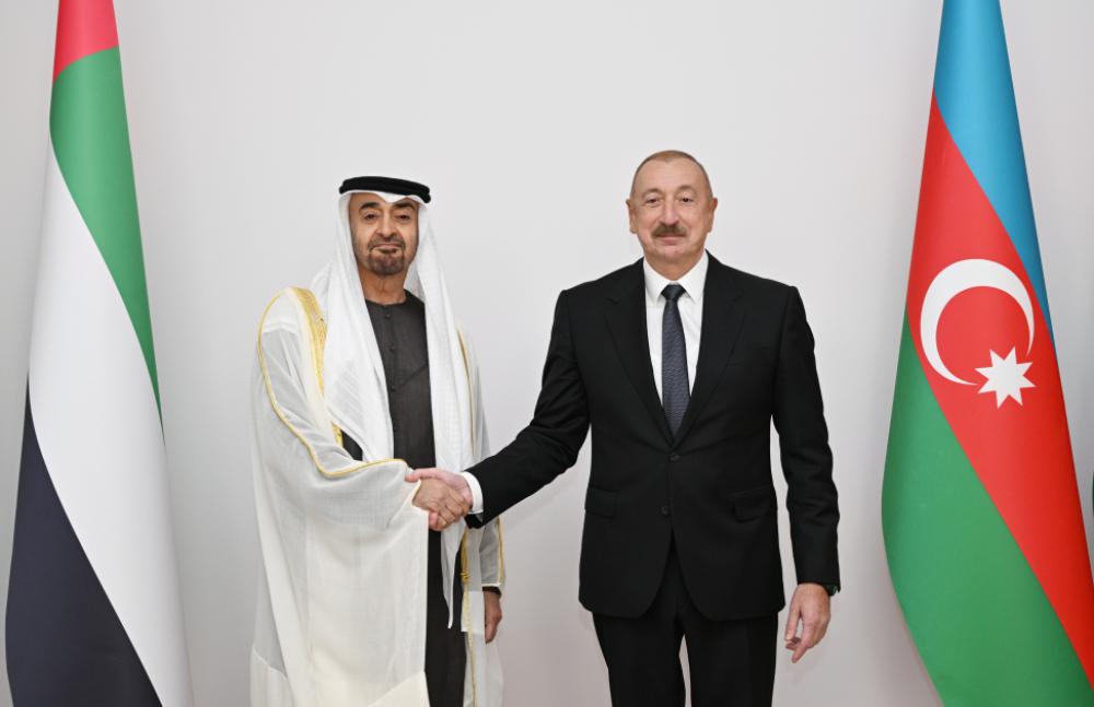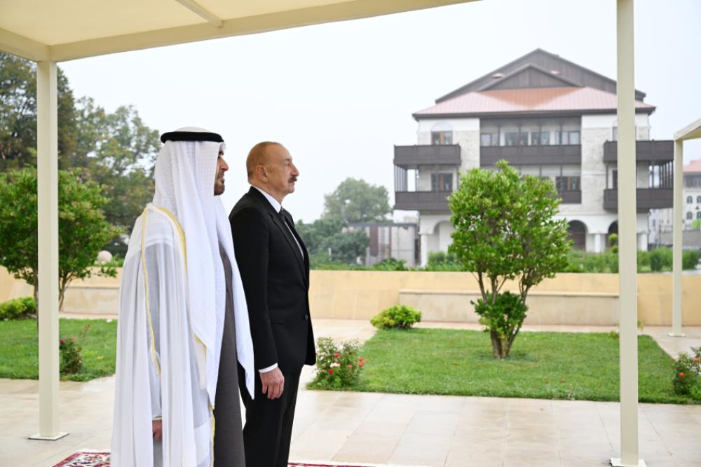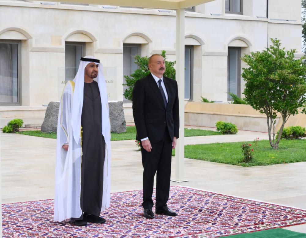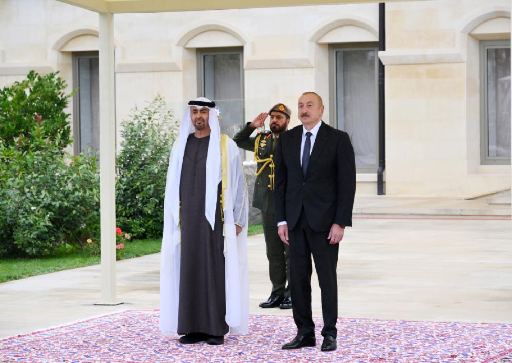 Təhlil.az xəbər verir ki, hər iki ölkənin dövlət bayraqlarının dalğalandığı meydanda Birləşmiş Ərəb Əmirliklərinin Prezidentinin şərəfinə fəxri qarovul dəstəsi düzülmüşdü.