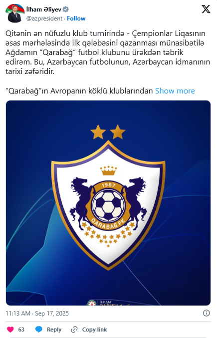"Qitənin ən nüfuzlu klub turnirində - Çempionlar Liqasının əsas mərhələsində ilk qələbəsini qazanması münasibətilə Ağdamın "Qarabağ" futbol klubunu ürəkdən təbrik edirəm. Bu, Azərbaycan futbolunun, Azərbaycan idmanının tarixi zəfəridir. "Qarabağ"ın Avropanın köklü klublarından biri olan "Benfika" ilə səfər matçında oyunun gedişində möhtəşəm geridönüş edərək parlaq qələbə çalması onun məğlubedilməz ruhunu, mübarizə əzmini göstərir. Bu qələbə ilə doğma komandamız Azərbaycan xalqına böyük sevinc bəxş etmişdir. Hər bir azərbaycanlı Avropada xariqələr yaradan "Qarabağ"la qürur duyur. Komandamıza Çempionlar Liqasının növbəti oyunlarında uğurlar və yeni-yeni zəfərlər arzu edirəm".