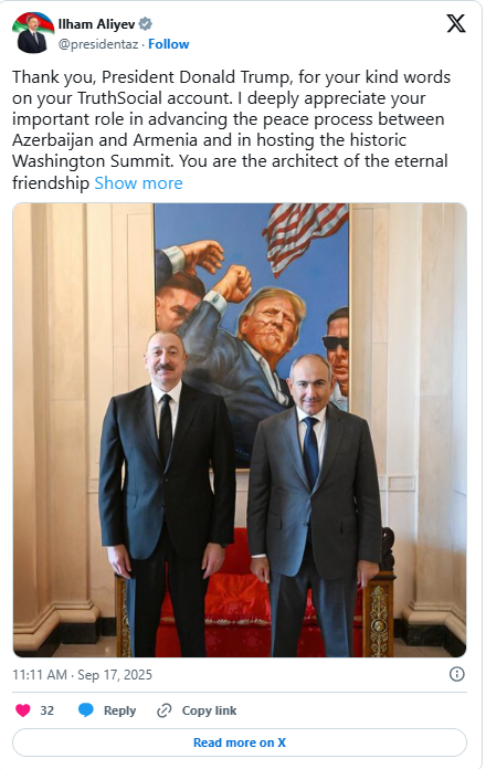 "Prezident Donald Tramp, TruthSocial hesabınızdakı xoş sözlərə görə təşəkkür edirəm. Azərbaycan və Ermənistan arasında sülh prosesinin irəliləyişində və tarixi Vaşinqton Sammitinin keçirilməsində Sizin mühüm rolunuzu dərindən qiymətləndirirəm. Siz Azərbaycan ilə ABŞ arasında əbədi dostluğun və formalaşmaqda olan strateji tərəfdaşlığın memarısınız. Mən dostluğumuzu çox yüksək qiymətləndirirəm", - dövlət başçısı qeyd edib.