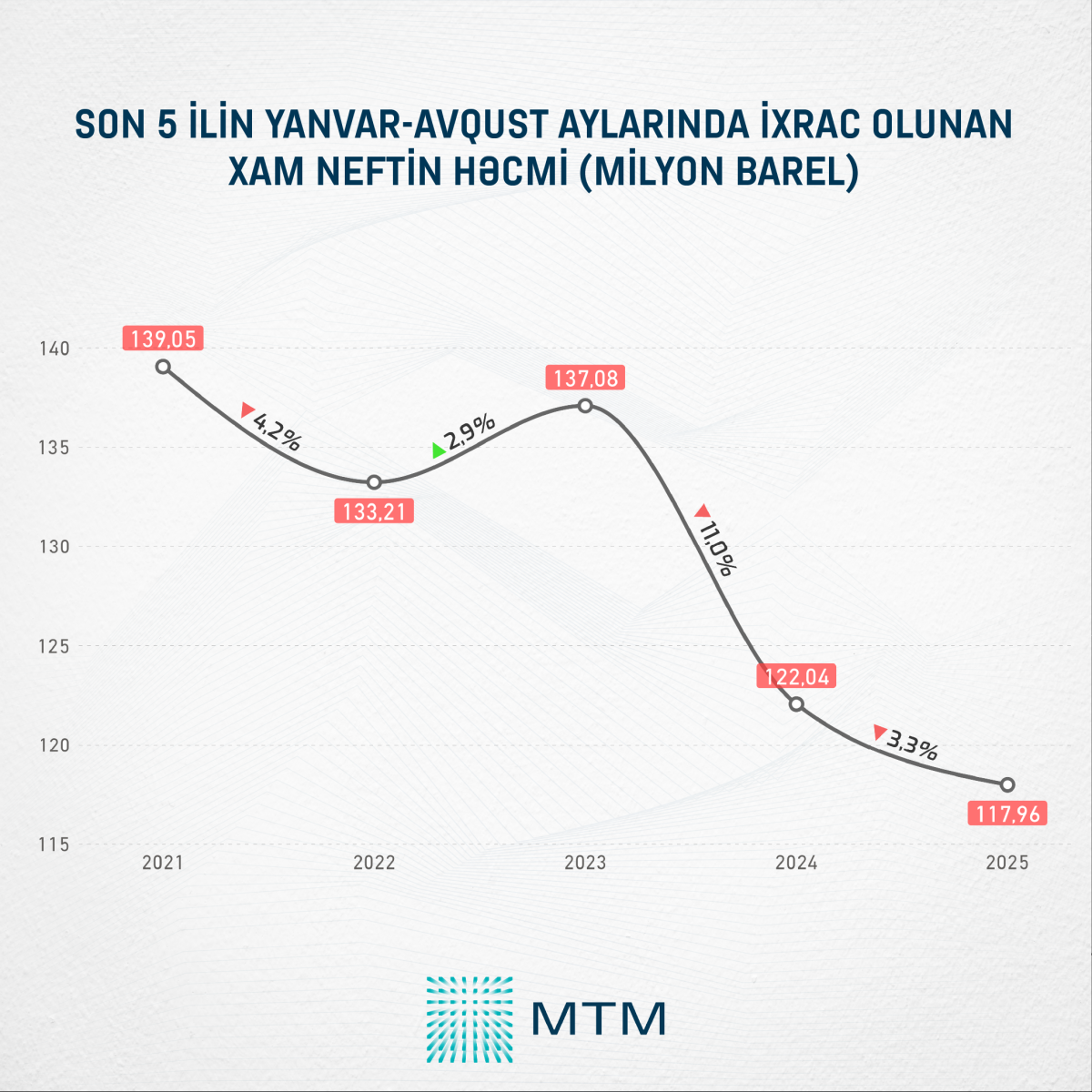 Media Təhlil Mərkəzinin (MTM) Dövlət Gömrük Komitəsinin açıqladığı rəsmi rəqəmlər əsasında apardığı təhlilə əsasən, 2025-ci ilin yanvar-avqust aylarında ölkəmizdən ixrac olunan xam neftin həcmi ötən ilin eyni dövrü ilə müqayisədə 3,3% və ya 4,08 milyon barel azalaraq 117,96 milyon barelə bərabər olub.