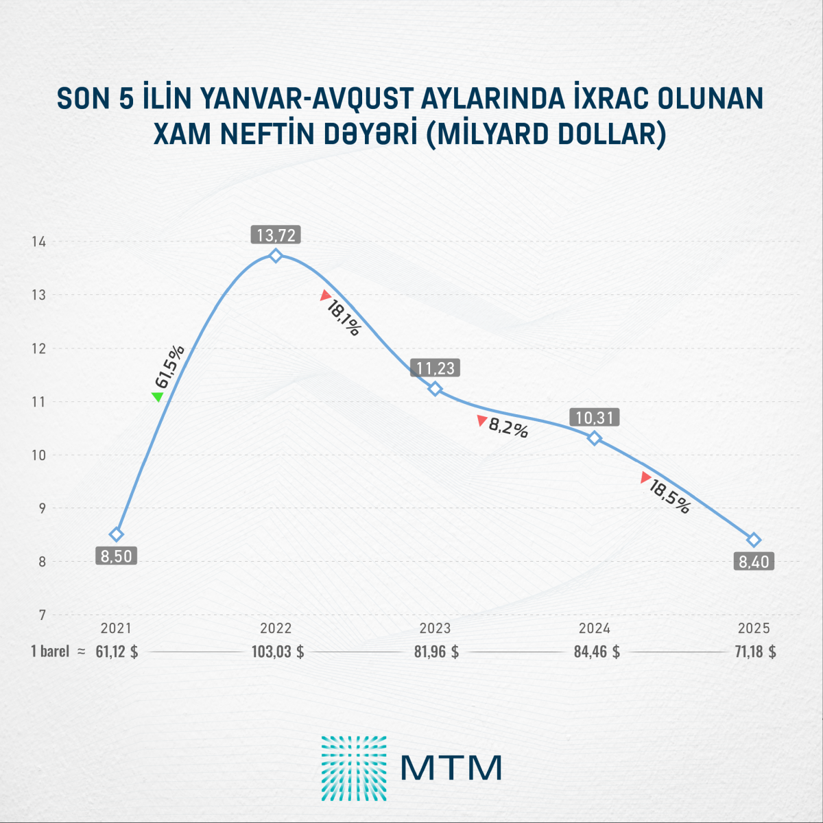 Neftin qiymətinin ən yüksək olduğu dövr isə 2022-ci ilə təsadüf edib. Həmin ilin ilk 8 ayının orta göstəricisinə əsasən, Azərbaycan neftinin bazar dəyəri bir barel üçün 103,03 dollar təşkil edib. Nəticədə həmin ilin yanvar-avqust aylarında ixrac olunan xam neftdən 13,72 milyard dollar gəlir əldə edilib ki, bu da son 5 il üzrə ən yüksək göstərici olub. Sonrakı illərdə həm dünya bazarında neftin qiymətinin düşməsi, həm də Azərbaycanın neft ixracının həcmini azaltması bu gəlirlərin azalmasına gətirib çıxarıb.
