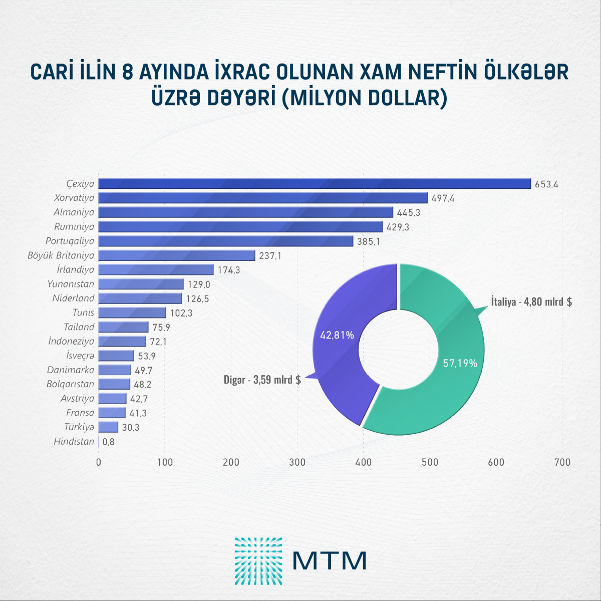 Cari ilin yanvar-avqust aylarında Azərbaycan 15 Avropa, 4 Asiya və 1 Afrika ölkəsi olmaqla ümumilikdə 20 ölkəyə xam neft ixracı həyata keçirib. Azərbaycan neftinin əsas alıcısı İtaliya olaraq qalıb. İlk 8 ay ərzində Azərbaycan neftinin 4,8 milyard dollar həcmində olan 57,19%-lik hissəsini İtaliya idxal edib. Qalan 42,81%-lik hissəsini, yəni 3,59 milyard dollar dəyərindəki xam nefti isə başda Çexiya olmaqla digər ölkələr idxal edib.