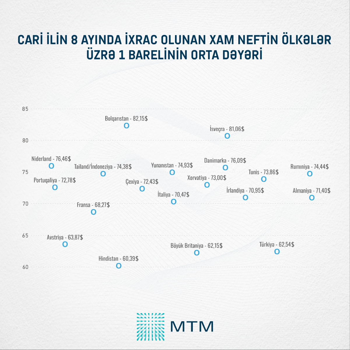 Daha öncə də qeyd etdiyimiz kimi, 2025-ci ilin 8 ayı ərzində Azərbaycan neftinin bir barelinin orta dəyəri 71,18 dollar təşkil edib. Azərbaycan neftini ən ucuz idxal edən ölkələr Hindistan (60,39$), Böyük Britaniya (62,15$), Türkiyə (62,54$) və Avstriya (63,87$) olub. Bu ölkələrdən daha baha amma, orta göstəricidən daha aşağı qiymətə neftimizi idxal edən ölkələr isə Fransa (68,27$), İtaliya (70,47$) və İrlandiya (70,95$) olub. Xam neftin ən baha qiymətə satıldığı ölkələr isə Bolqarıstan (82,15$) və İsveçrə (81,06$) olub.