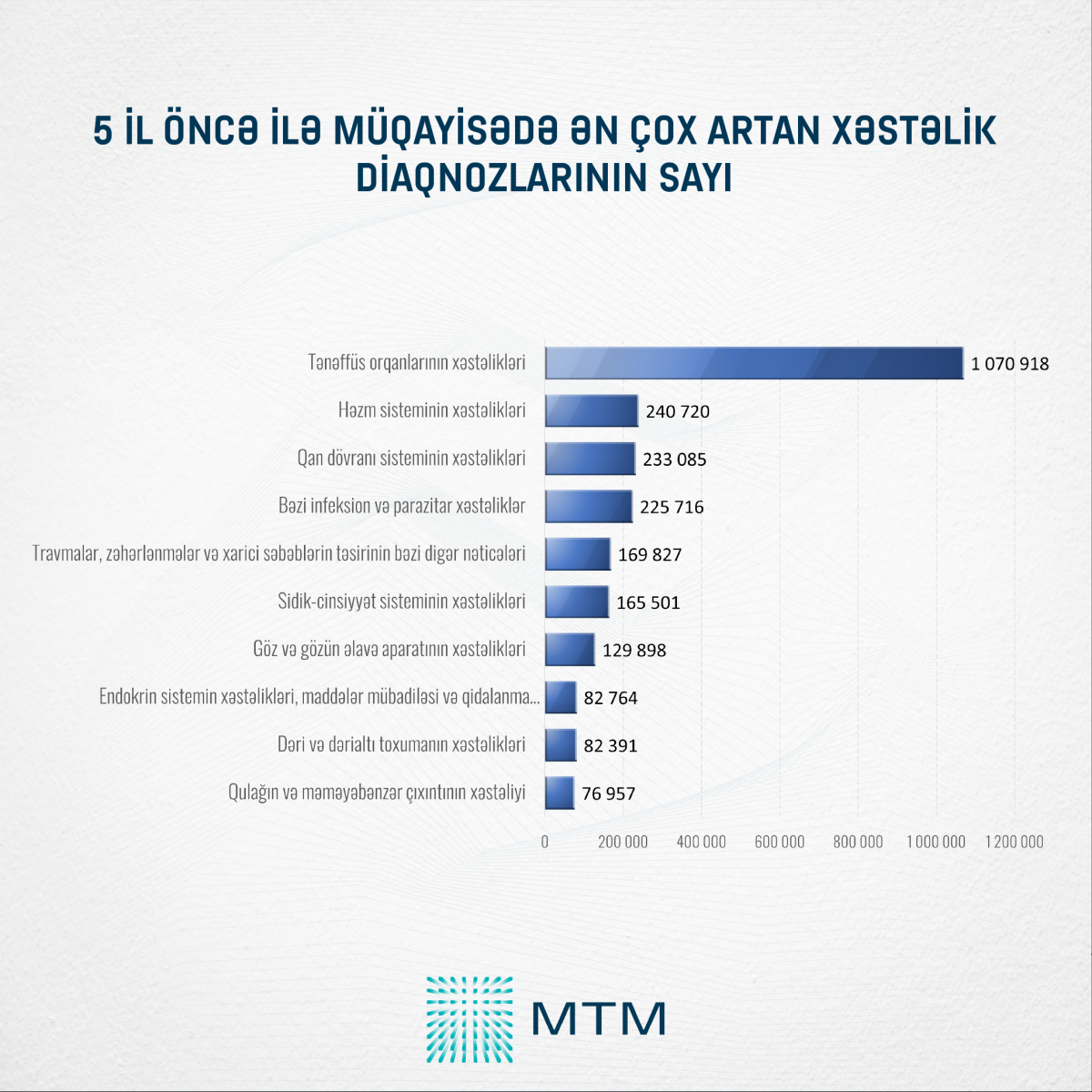 Media Təhlil Mərkəzinin (MTM) Dövlət Statistika Komitəsinin açıqladığı rəsmi rəqəmlər əsasında apardığı təhlilə görə, 2020-ci ildə “ilk dəfə qoyulmuş diaqnozla qeydə alınmış xəstələrin sayı” 1 800 853 nəfər idisə, 2024-cü ildə bu rəqəm 2 870 154 nəfərə çatıb.