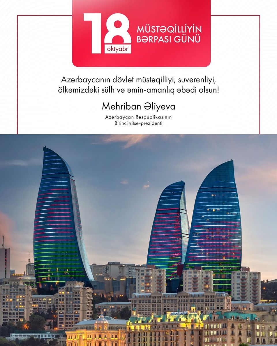 Birinci vitse-prezident Mehriban Əliyeva 18 Oktyabr Müstəqilliyin Bərpası Günü ilə bağlı paylaşım edib.