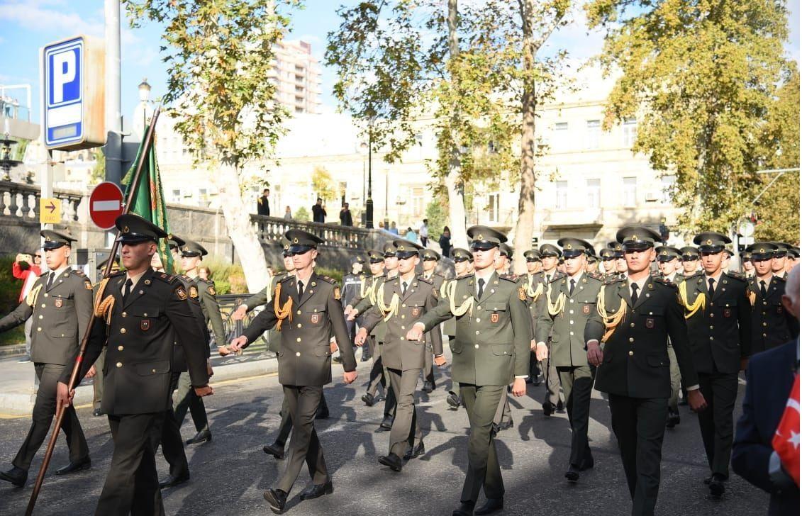 Bakıda Zəfər Gününün beşinci ildönümünün qeyd olunması münasibətilə hərbi orkestrlərin müşayiəti ilə yürüşlər keçirilir.
