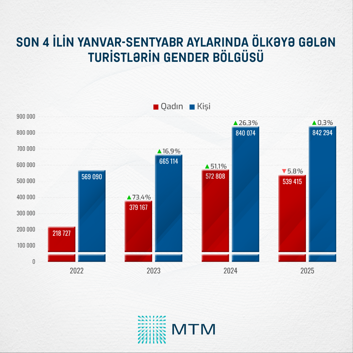 Rəsmi rəqəmlər əsasında aparılan təhlilə əsasən, son illərdə ilk dəfədir ki, ölkəyə turist axınında qadınların sayında azalma qeydə alınıb. 2022–2024-cü illər ərzində qadın turistlərin sayı ardıcıl şəkildə artaraq 218 727 nəfərdən 379 167 nəfərə, daha sonra isə 572 808 nəfərə yüksəlib.