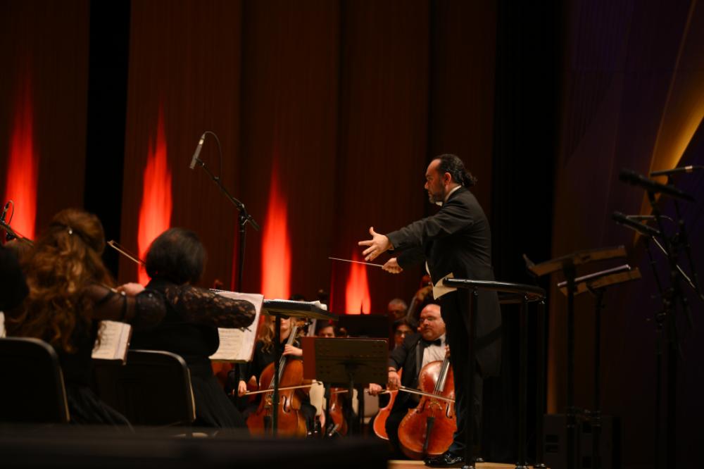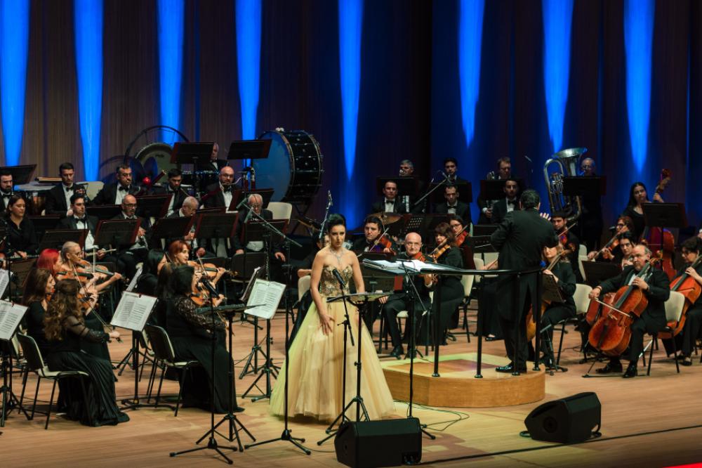 Səhnədə Üzeyir Hacıbəyli adına Dövlət Simfonik Orkestrini tanınmış italiyalı dirijor Françesko İvan Çampa (Francesco Ivan Ciampa) idarə edib.
