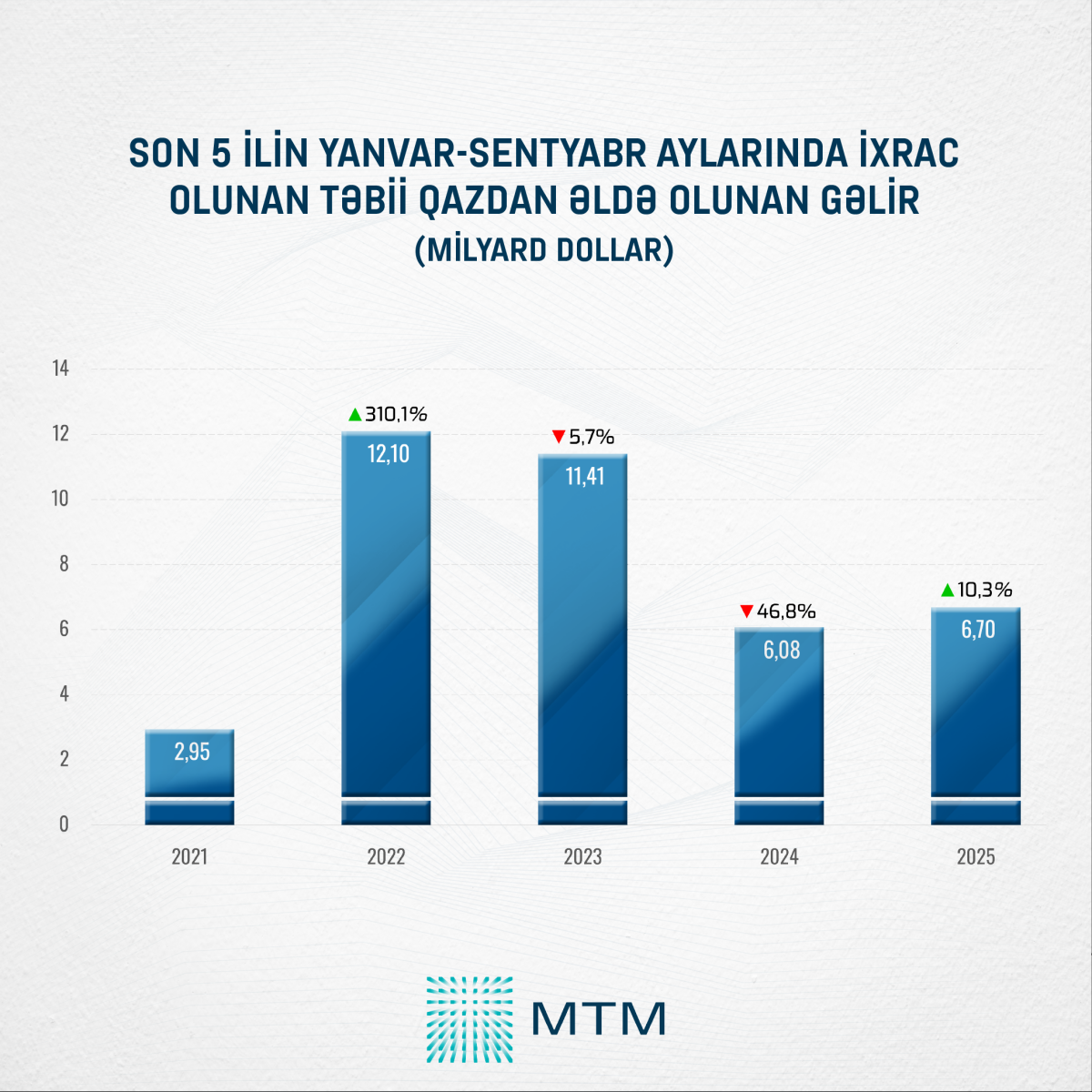 2025-ci ildə isə müəyyən bərpa tendensiyası müşahidə olunur. Cari ilin yanvar–sentyabr dövrü üzrə təbii qaz gəlirləri 6,7 milyard dollar olub. Bu, əvvəlki ilin eyni dövrü ilə müqayisədə 0,62 milyard dollar və ya 10,3% artım deməkdir.
