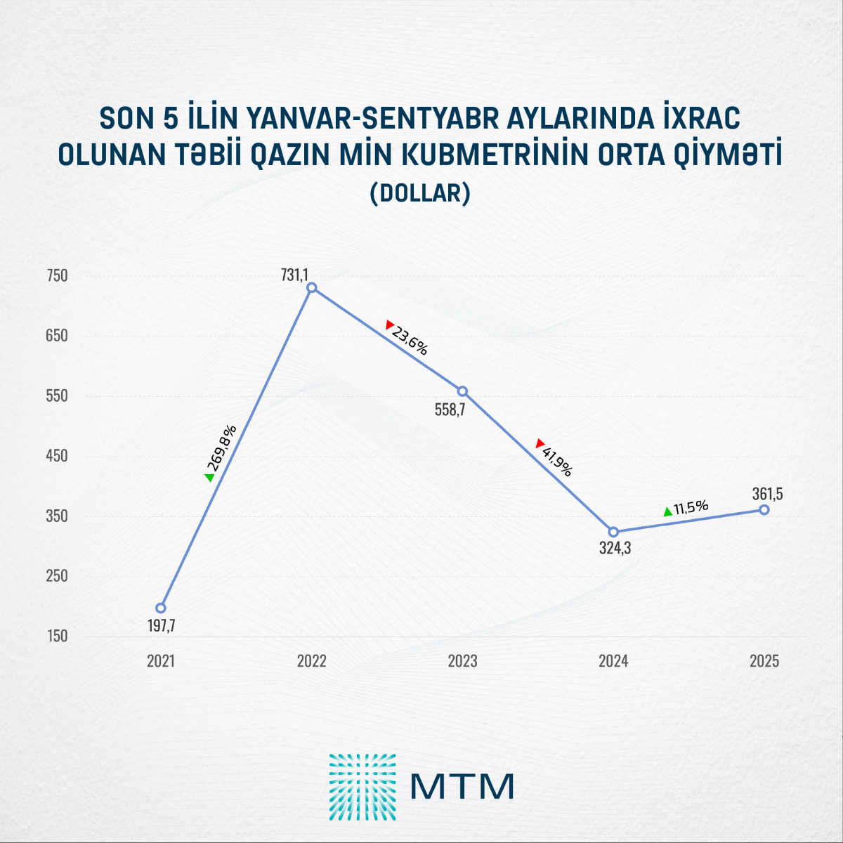2025-ci ilin ilk doqquz ayı üzrə müəyyən bərpa meyli müşahidə edilir. Hər min kubmetr üçün ixrac qiyməti ötən ilin eyni dövrünə nisbətən 11,5 % artaraq 361,5 dollar olub. Artım qeydə alınsa da, ümumi dinamika əvvəlki pik illərlə müqayisədə daha aşağı səviyyədədir.