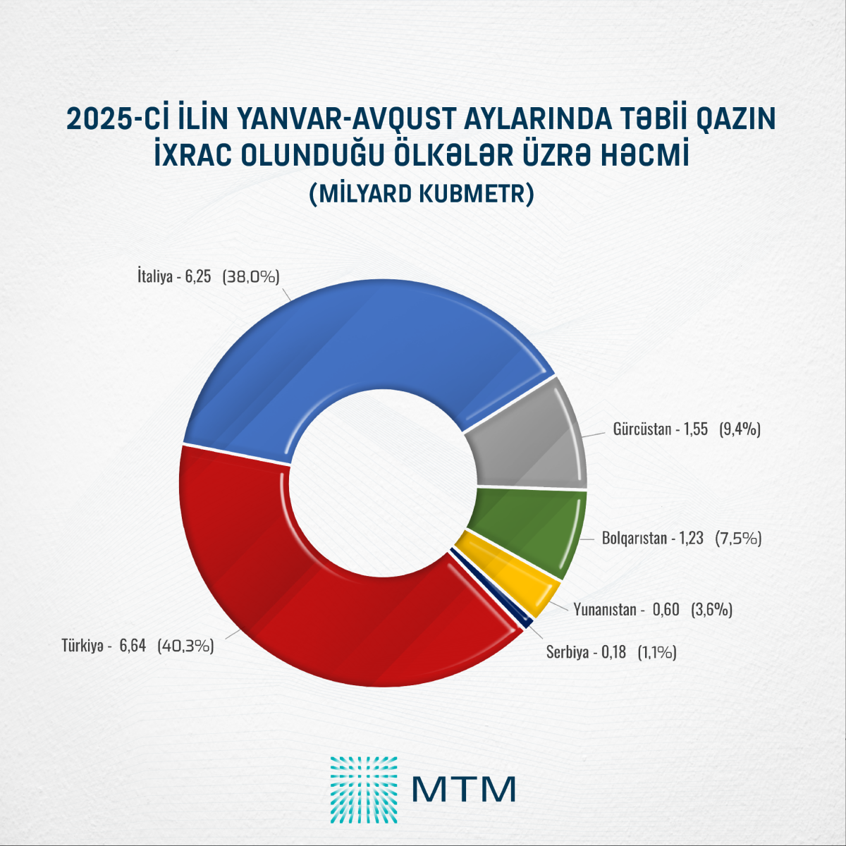 Son məlumatlara əsasən, 2025-ci ilin yanvar–sentyabr aylarında Azərbaycanın təbii qaz ixracının coğrafi bölgüsü əsasən iki ölkənin üzərində cəmləşib. Bu dövrdə ixracın ən böyük payı qardaş Türkiyəyə məxsus olub. Belə ki, Türkiyəyə 6,64 milyard kubmetr təbii qaz satılıb ki, bu da ümumi ixracın 40,3 faizini təşkil edir.