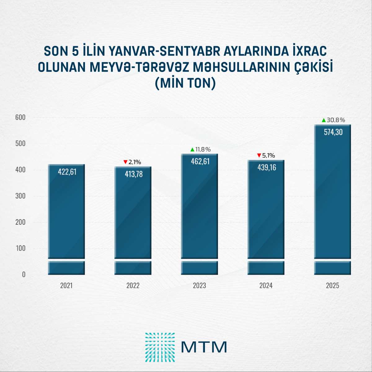 Media Təhlil Mərkəzinin (MTM) Dövlət Statistika Komitəsinin rəsmi məlumatları əsasında apardığı təhlilə görə, 2025-ci ilin yanvar–sentyabr aylarında meyvə-tərəvəz ixracı 574,3 min ton təşkil edib. Bu göstərici 2024-cü ilin müvafiq dövrü ilə müqayisədə 135 min ton və ya 30,8% çoxdur və son beş ilin ən yüksək nəticəsi hesab olunur.