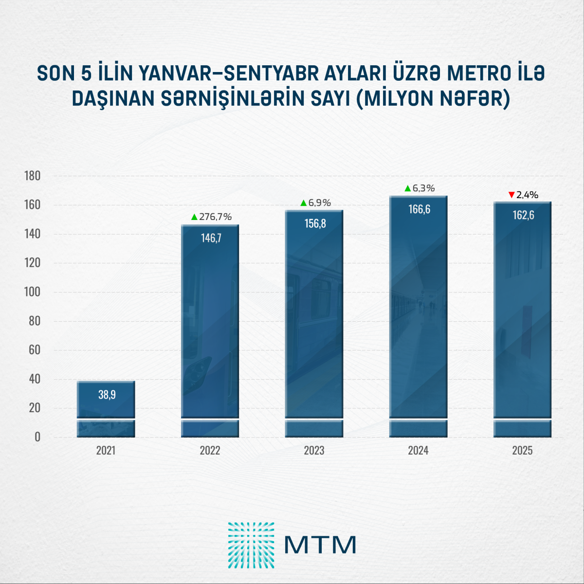 Qeyd edək ki, təhlil olunan dövrdə 2025-ci ilin yanvar–sentyabr ayları azalma ilə yadda qalıb. Belə ki, bu dövrdə metrodan istifadə edən sərnişinlərin sayı 162,6 milyon nəfər olub ki, bu da əvvəlki ilin müvafiq dövrü ilə müqayisədə 2,4% və ya 4 milyon nəfər azalma deməkdir. Azalmanın əsas səbəbləri kimi avtobus marşrutlarının sayının artırılması və yenilənməsi, eləcə də şəxsi avtomobillərin sayının artması göstərilə bilər.