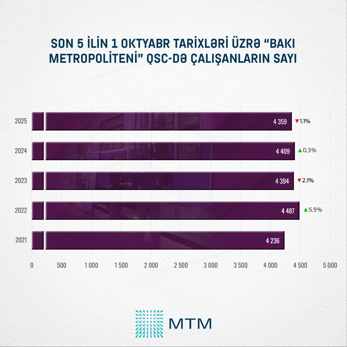 Son 5 ilin 1 oktyabr tarixləri üzrə Bakı Metropoliteni QSC-də çalışan işçilərin sayına dair müqayisə göstərir ki, 2021-ci ildə müəssisədə 4 236 nəfər çalışıb. 2022-ci ildə işçilərin sayı 4 487 nəfərə yüksələrək əvvəlki illə müqayisədə 251 nəfər və ya 5,9 % artım qeydə alınıb. 2023-cü ildə işçilərin sayı 4 394 nəfər təşkil edib ki, bu da 2022-ci illə müqayisədə 93 nəfər və ya 2,1% azalma deməkdir. 2024-cü ilin 1 oktyabr tarixində Bakı Metropoliteni QSC-də çalışan işçilərin sayı 4 409 nəfər olub və bu göstərici 2023-cü ilin müvafiq dövrü ilə müqayisədə 15 nəfər və ya 0,3% çoxdur. 2025-ci ilin 1 oktyabr tarixində isə Bakı Metropoliteni QSC-də çalışan işçilərin sayı 4 359 nəfər təşkil edib ki, bu da əvvəlki ilin müvafiq dövrü ilə müqayisədə 50 nəfər və ya 1,1% azalma deməkdir.