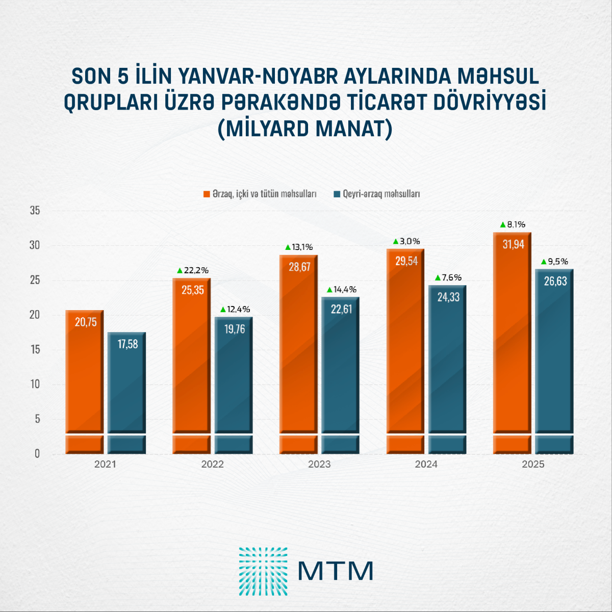 2025-ci ildə hər iki məhsul qrupu üzrə artım tempi yenidən sürətlənib. Ərzaq, içki və tütün məhsulları üzrə göstərici 2,4 milyard manat və ya 8,1 faiz artaraq 31,94 milyard manata çatıb. Qeyri-ərzaq məhsulları üzrə isə artım 2,3 milyard manat və ya 9,5 faiz təşkil edib və göstərici 26,63 milyard manat olub.