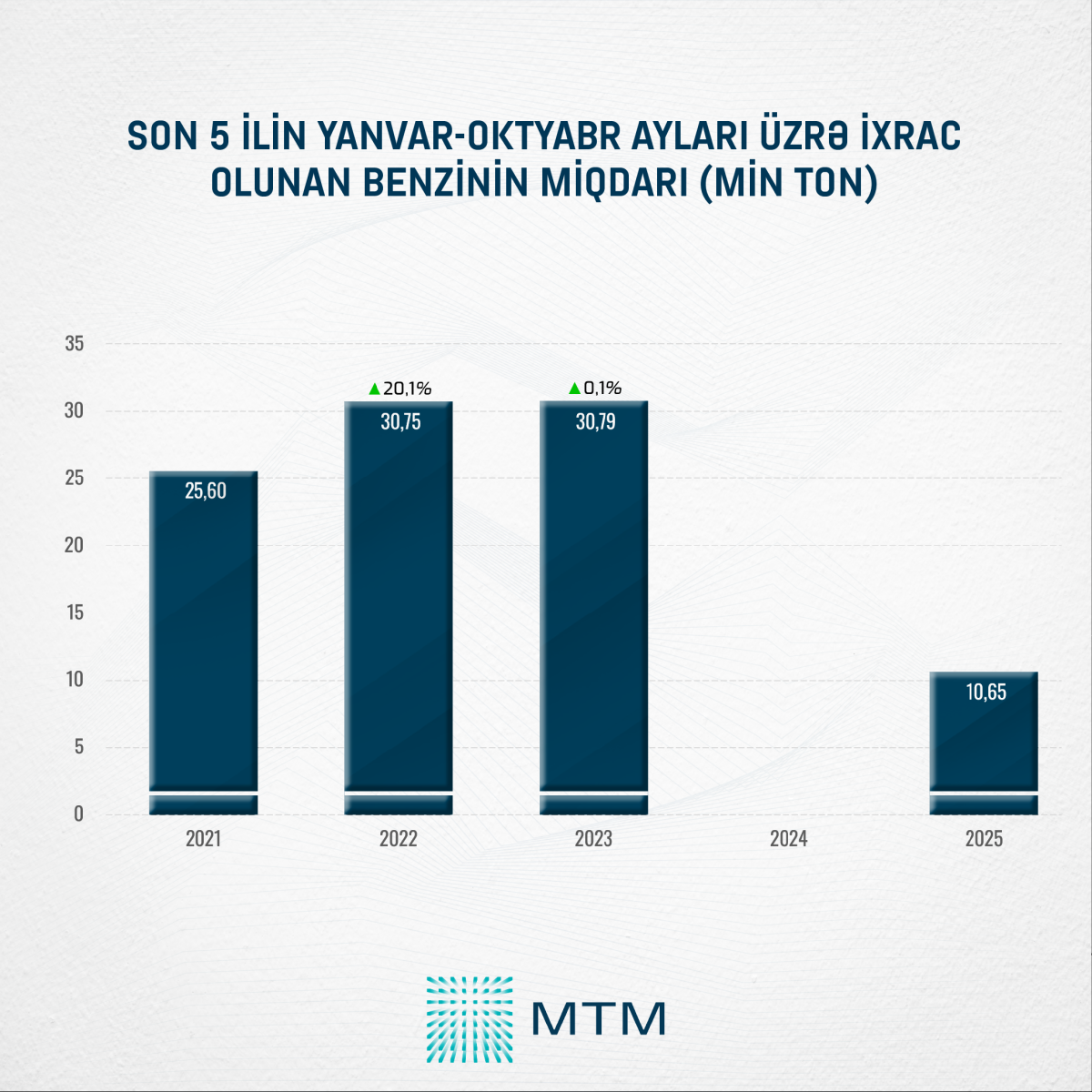 Media Təhlil Mərkəzinin (MTM) Dövlət Statistika Komitəsinin açıqladığı rəsmi məlumatlar əsasında apardığı təhlilə görə, 2025-ci ilin yanvar–oktyabr aylarında Azərbaycandan 10,65 min ton benzin ixrac olunub.