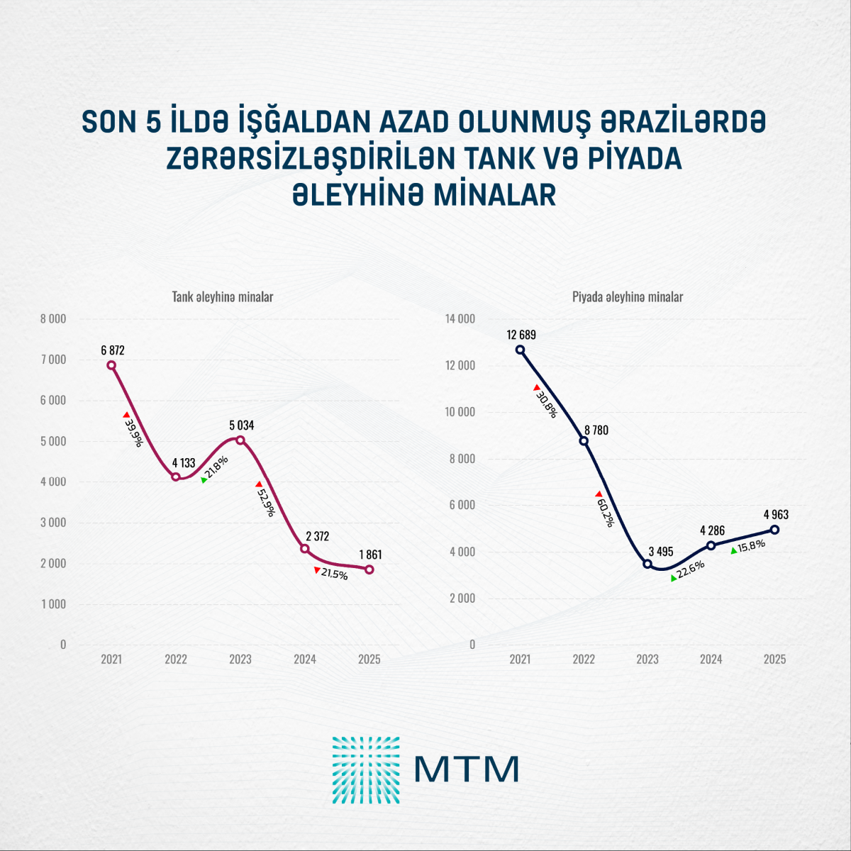 Aparılan təhlil nəticəsində müəyyən edilib ki, 2025-ci ildə işğaldan azad olunmuş ərazilərdə həyata keçirilən minatəmizləmə əməliyyatları zamanı 1 861 ədəd tank əleyhinə mina və 4 963 ədəd piyada əleyhinə mina aşkar edilərək zərərsizləşdirilib.