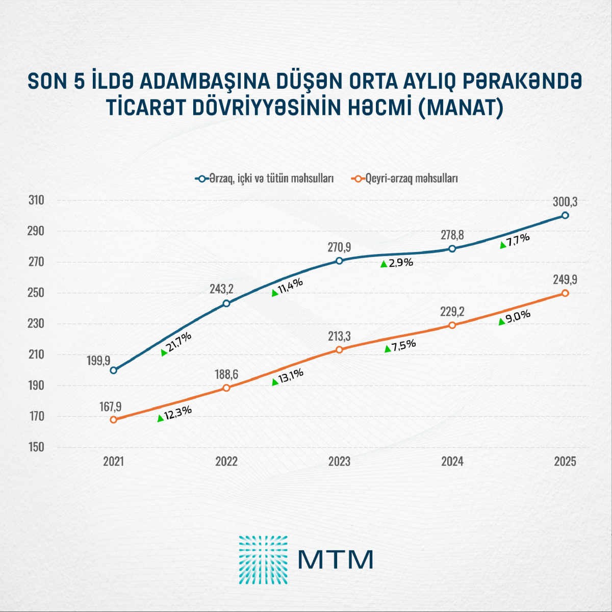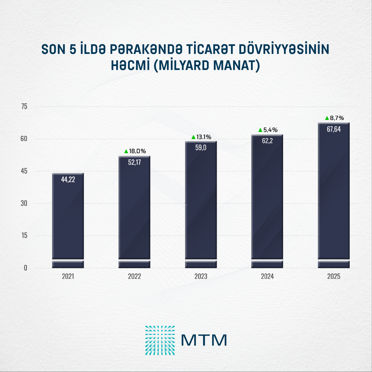 Media Təhlil Mərkəzinin (MTM) Dövlət Statistika Komitəsinin açıqladığı rəsmi statistik məlumatlar əsasında apardığı təhlilə görə, 2025-ci ildə ölkədə pərakəndə ticarət dövriyyəsinin həcmi 2024-cü illə müqayisədə 8,7 faiz və ya 5,44 milyard manat artaraq 67,64 milyard manat təşkil edib. Müqayisə üçün qeyd edək ki, 2024-cü ildə pərakəndə ticarət dövriyyəsinin həcmi 62,2 milyard manat olub.