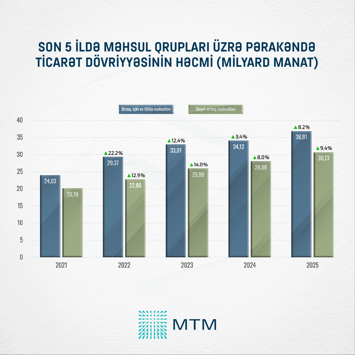 Son beş il ərzində həm ərzaq, içki və tütün məhsullarının, həm də qeyri-ərzaq məhsullarının pərakəndə ticarət dövriyyəsində hər il davamlı artım müşahidə olunub. Belə ki, 2021-ci ildə ərzaq, içki və tütün məhsullarına 24,03 milyard manat, qeyri-ərzaq məhsullarına isə 20,19 milyard manat vəsait xərclənib. 2022-ci ildə ərzaq, içki və tütün məhsulları üzrə xərclər əvvəlki illə müqayisədə 5,34 milyard manat və ya 22,2 faiz artaraq 29,37 milyard manata çatıb. Qeyri-ərzaq məhsulları üzrə isə 2,61 milyard manat və ya 12,9 faiz artım qeydə alınıb.