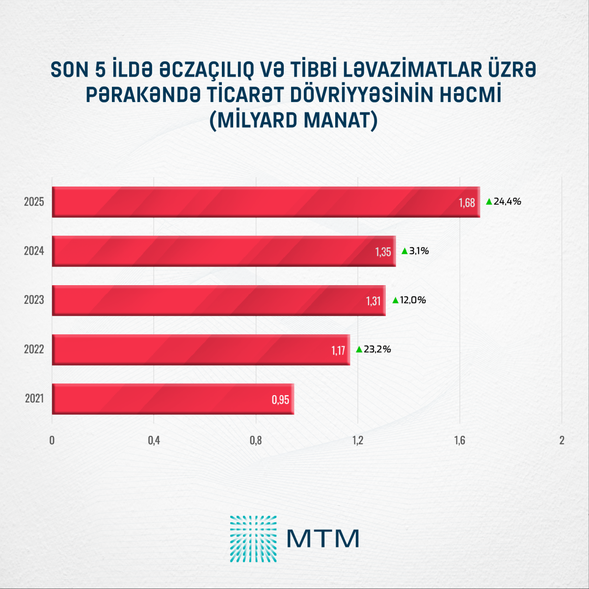 2021-ci ildə pərakəndə ticarət dövriyyəsində əhalinin əczaçılıq və tibbi ləvazimatlara yönəltdiyi xərclərin həcmi 0,95 milyard manat təşkil edib. 2022-ci ildə bu göstərici əvvəlki illə müqayisədə 0,22 milyard manat və ya 23,2 faiz artaraq 1,17 milyard manata yüksəlib. 2023-cü ildə əczaçılıq və tibbi ləvazimatlar üzrə xərclər əvvəlki illə müqayisədə 0,14 milyard manat və ya 12 faiz artaraq 1,31 milyard manat səviyyəsində qeydə alınıb. 2025-ci ildə isə əhalinin əczaçılıq və tibbi ləvazimatlara xərclədiyi vəsait 2024-cü illə müqayisədə 0,33 milyard manat və ya 24,4 faiz artaraq 1,68 milyard manat təşkil edib.