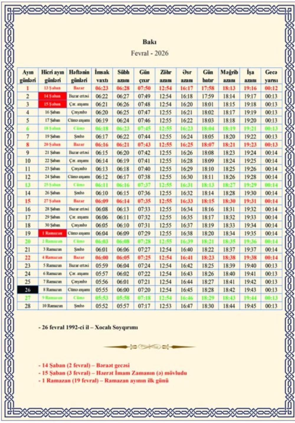 Ramazan ayının təqvimi açıqlanıb