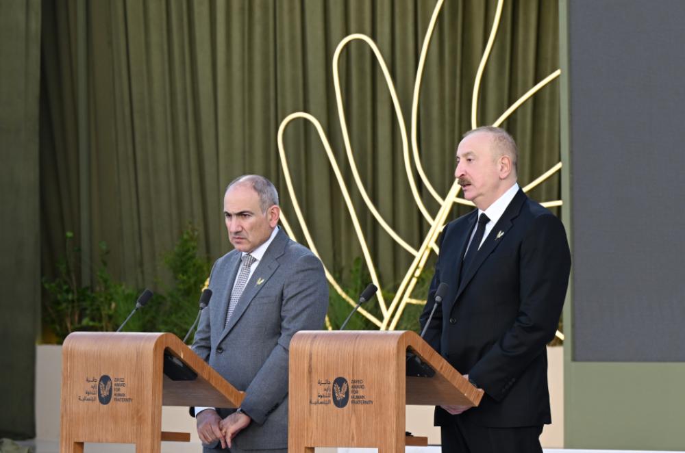 Dinlərarası dialoqun inkişafına verdikləri töhfəyə, həmçinin sivilizasiyaların bir-birinə daha da yaxınlaşması istiqamətində göstərdikləri səylərə görə Əl-Əzhərin Böyük İmamı, Zati-aliləri doktor Əhməd Əl-Tayyibə və Roma Papası, Zati-müqəddəsləri Leoya dərin minnətdarlığımı bildirmək istəyirəm. Mərasimə ünvanladıqları xoş müraciətlərində bir daha Azərbaycan və Ermənistan arasında sülhün əhəmiyyətini vurğulayan bütün həmkarlarıma da minnətdarlığımı bildirirəm. Bu sülh təkcə iki ölkə üçün deyil, daha geniş region üçün də böyük əhəmiyyət kəsb edir. Biz 30 ildən artıq müddətdə müharibə şəraitində olmuşuq. İndi isə artıq altı aydır ki, sülh şəraitində yaşayırıq.
