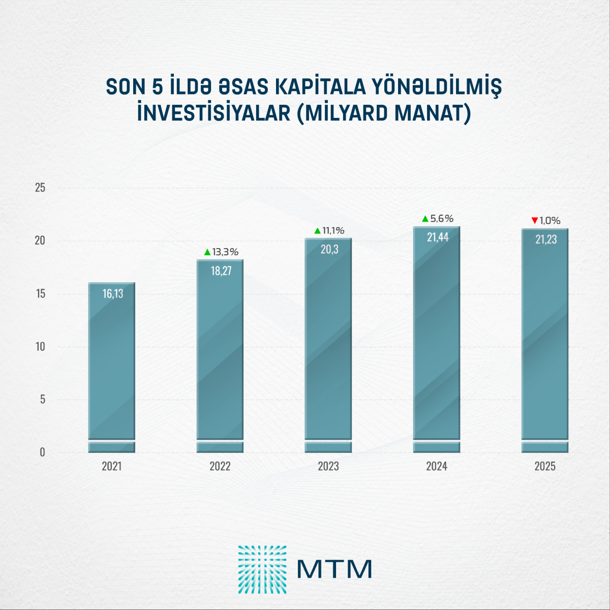 Media Təhlil Mərkəzinin (MTM) Dövlət Statistika Komitəsinin açıqladığı rəsmi məlumatlar əsasında apardığı təhlilə əsasən, 2025-ci ildə ölkənin iqtisadi və sosial sahələrinin inkişafı məqsədilə bütün maliyyə mənbələri hesabına əsas kapitala yönəldilmiş investisiyaların həcmi əvvəlki illə müqayisədə 1% və ya 0,21 milyard manat azalaraq 21,23 milyard manat təşkil edib. 2024-cü ildə əsas kapitala yönəldilmiş investisiyaların həcmi 2023-cü illə müqayisədə 5,6% və ya 1,14 milyard manat artıb. Belə ki, 2023-cü ildə əsas kapitala yönəldilən investisiyaların həcmi 20,3 milyard manat səviyyəsində qeydə alınıb. 2021-ci ildə əsas kapitala 16,13 milyard manat investisiya yönəldildiyi halda, 2022-ci ildə bu göstərici 2,14 milyard manat və ya 13,3% artaraq 18,27 milyard manata çatıb.