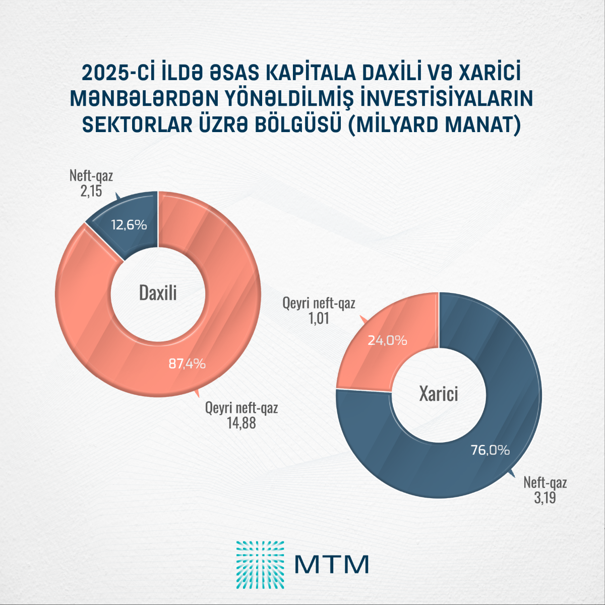 Ümumilikdə, 2025-ci ildə əsas kapitala yönəldilmiş investisiyaların 25,2%-i və ya 5,34 milyard manatı neft-qaz sektorunun, 74,8%-i və ya 15,89 milyard manatı isə qeyri-neft-qaz sektorunun payına düşüb.