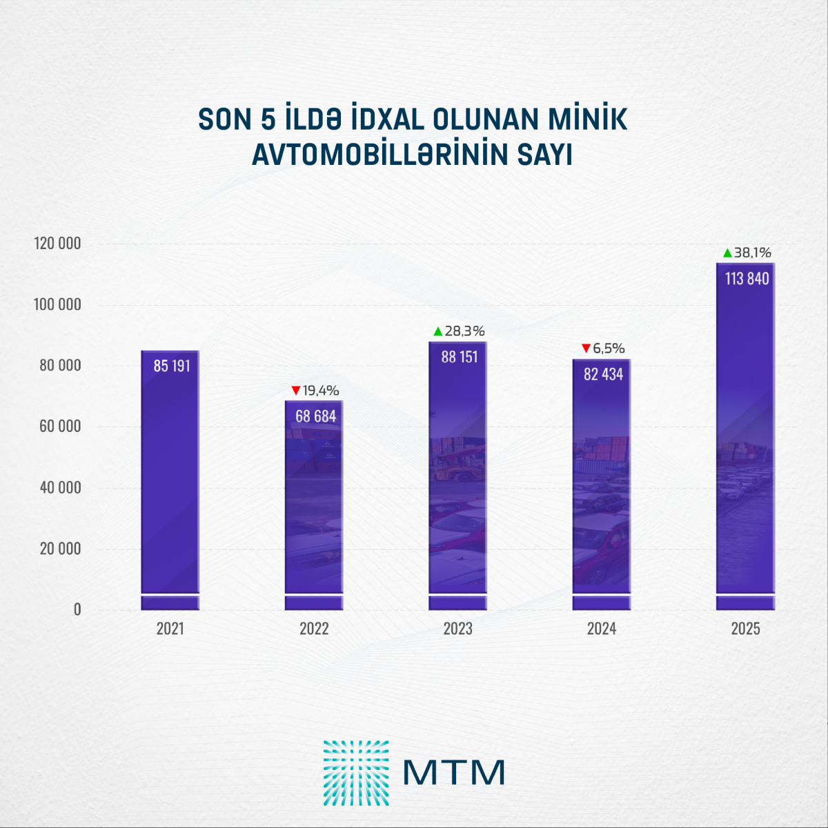 2025-ci ildə minik avtomobili idxalında əhəmiyyətli artım baş verib. 2024-cü illə müqayisədə idxal 38,1% və ya 31 406 ədəd artaraq 113 840 ədədə çatıb.