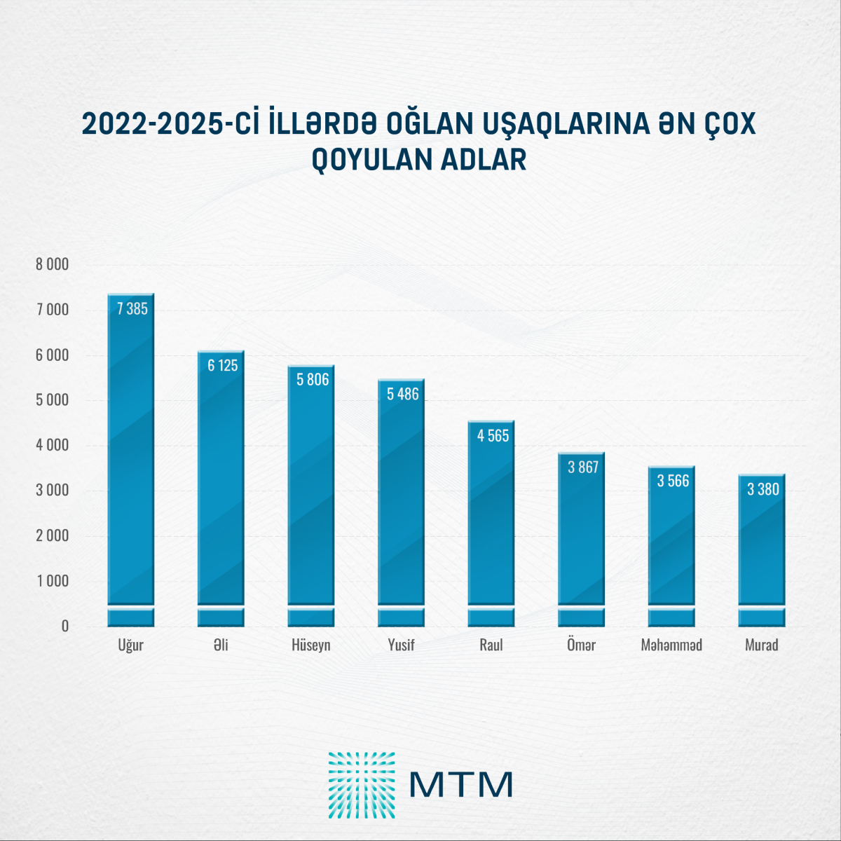 Media Təhlil Mərkəzinin (MTM) Ədliyyə Nazirliyinin rəsmi məlumatları əsasında apardığı təhlilə görə, 2022–2025-ci illərdə yeni doğulan oğlan uşaqlarına ən çox verilən ad Uğur olub.
